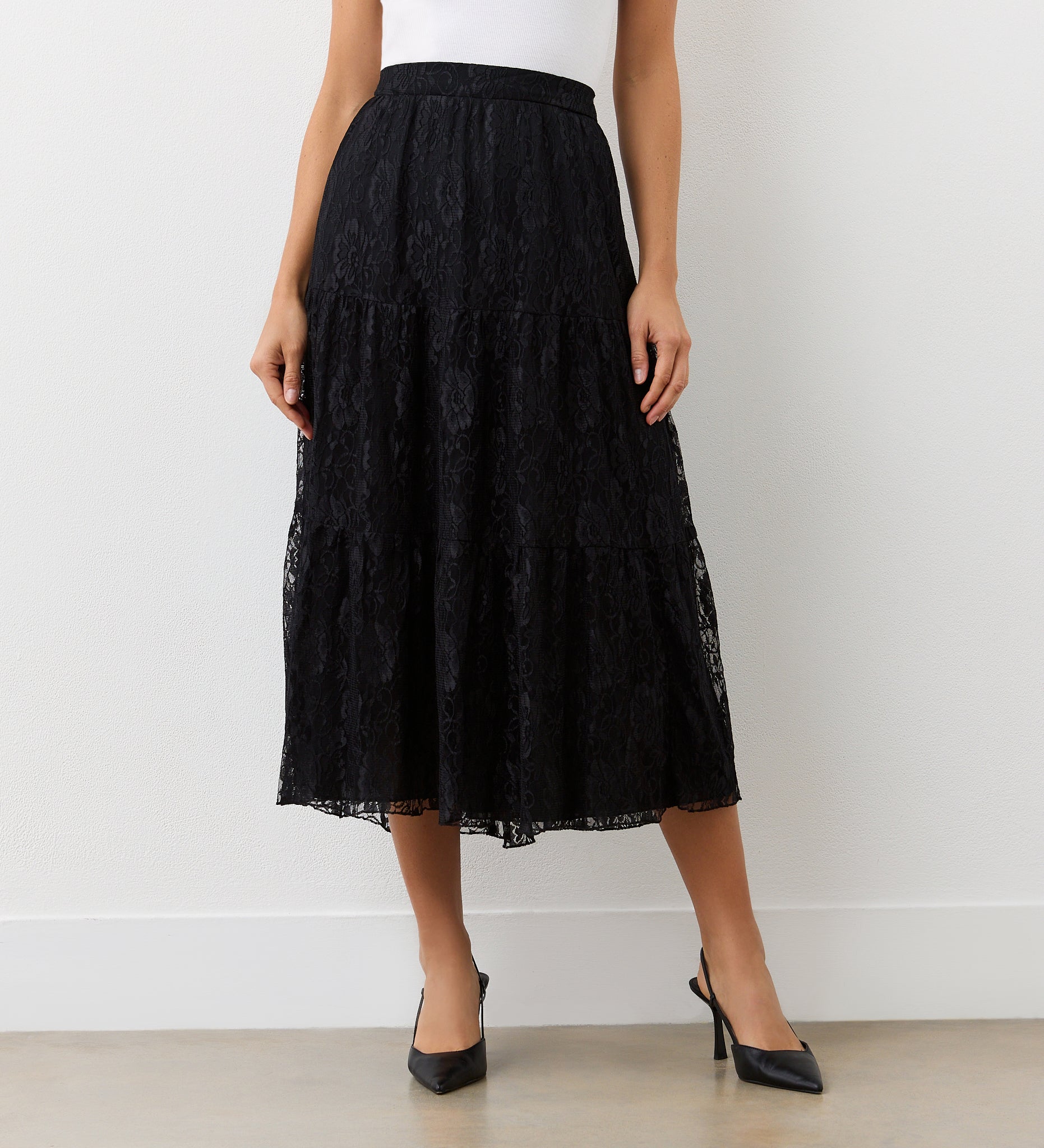 Crafted from a stretch floral lace fabric, Abbie is a fully lined, tiered midi skirt with an elasticated, flat waistband, front and back.
