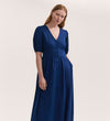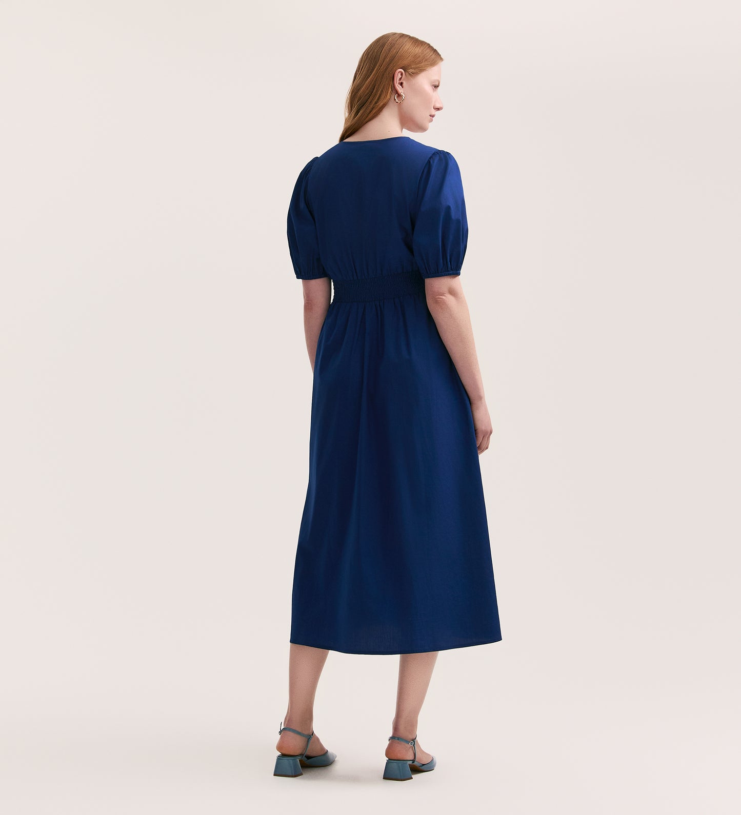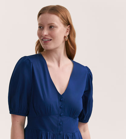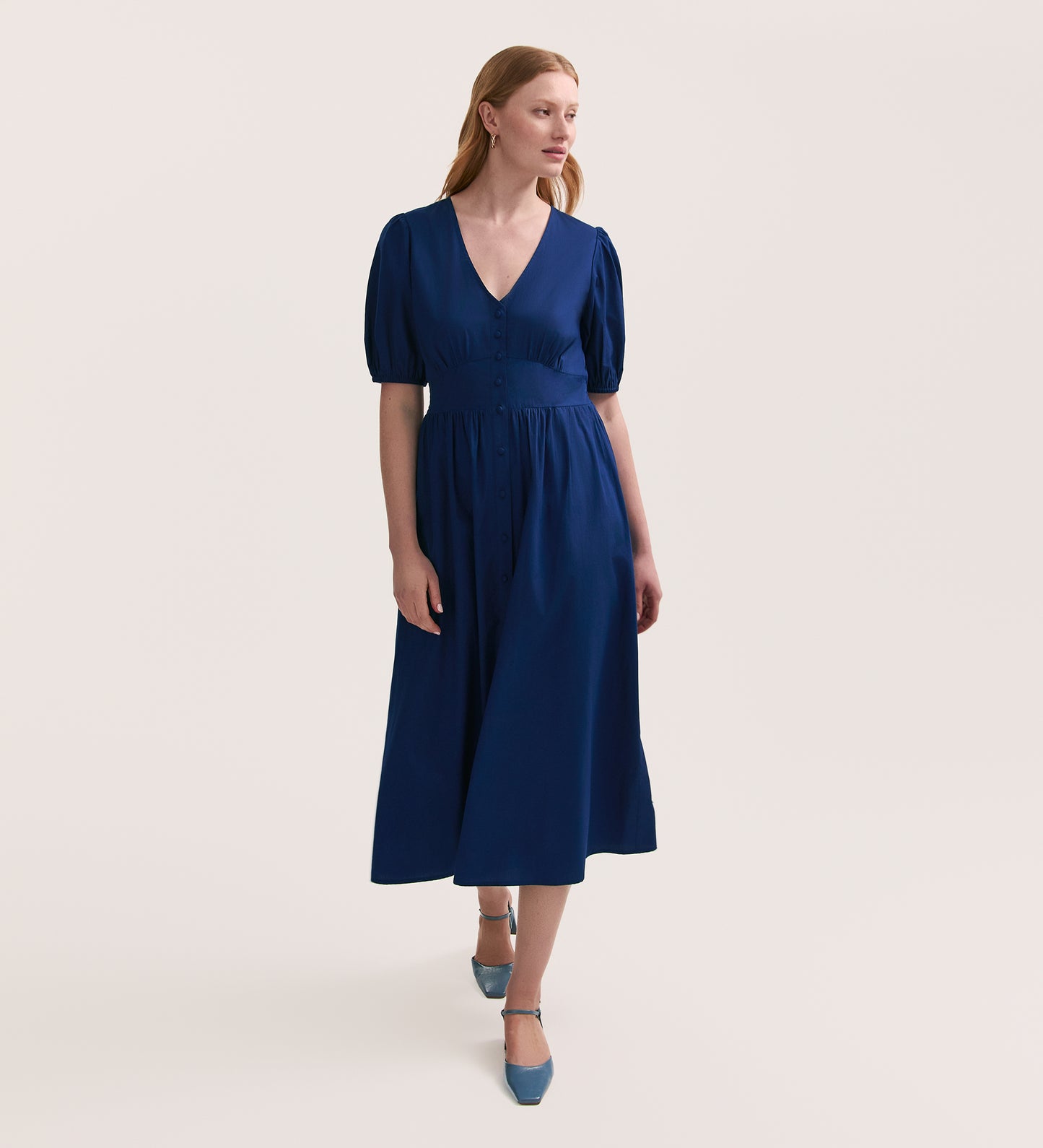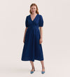 Addison is an indigo blue v-neck midi tea dress crafted from our cotton seersucker fabric. With short puff sleeves, button-down front and a waist seam, she's a flattering yet stylish addition for every wardrobe.