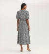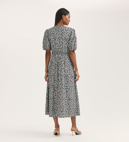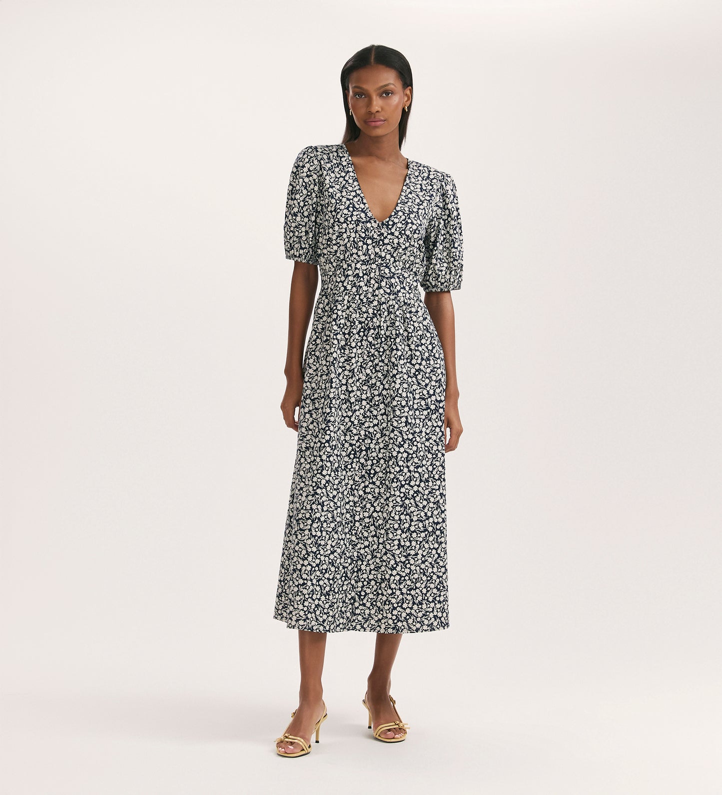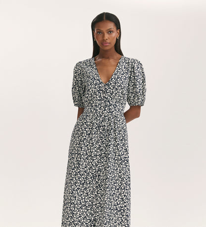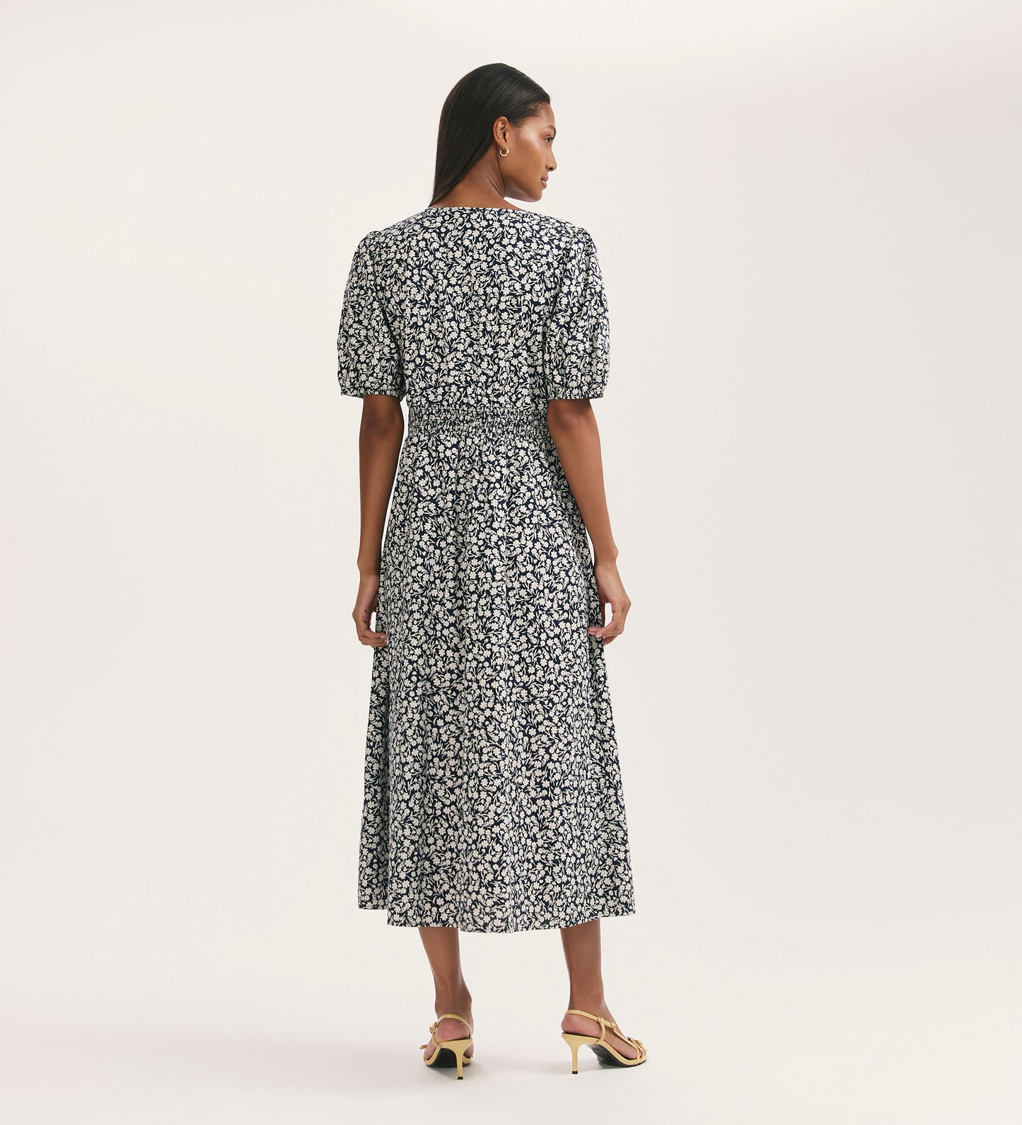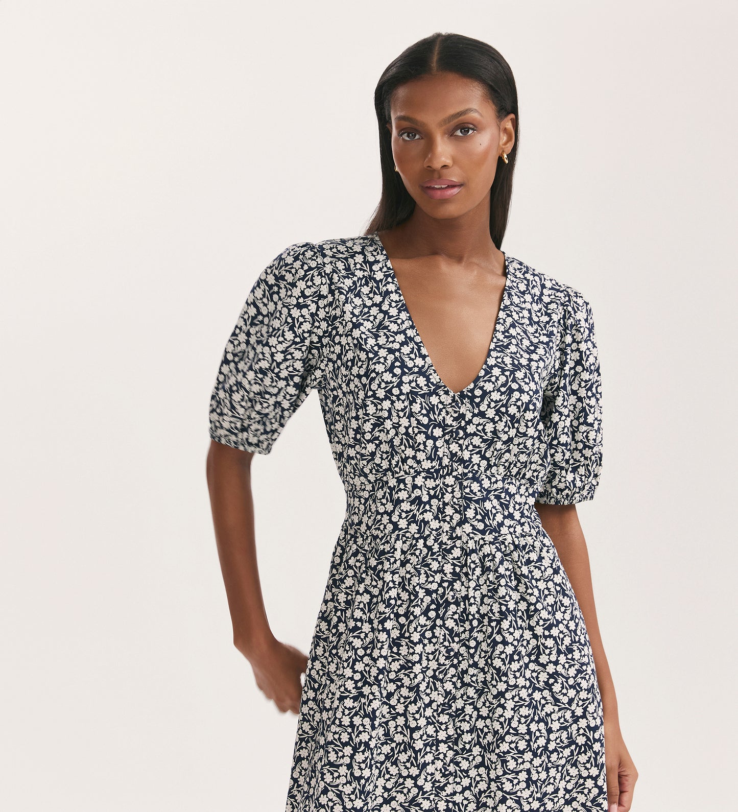 Addison is a navy floral midi tea dress crafted from our cotton fabric. With short puff sleeves, a v-neck, button-down front and a waist seam, she's a flattering yet stylish addition for every wardrobe.