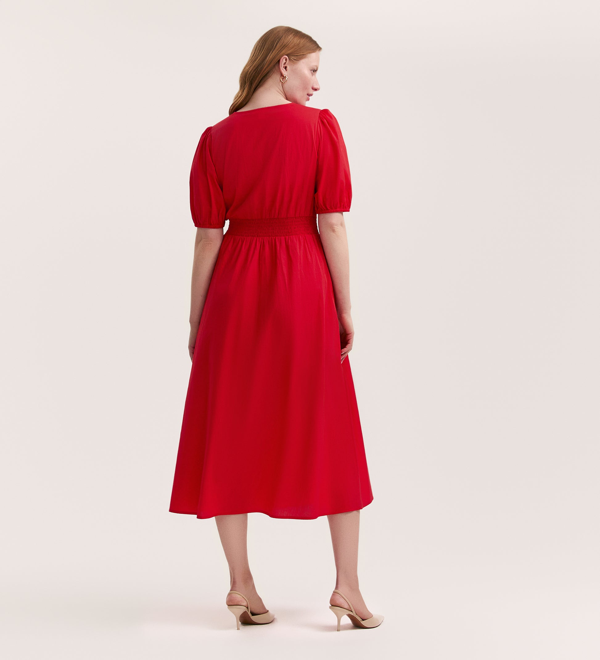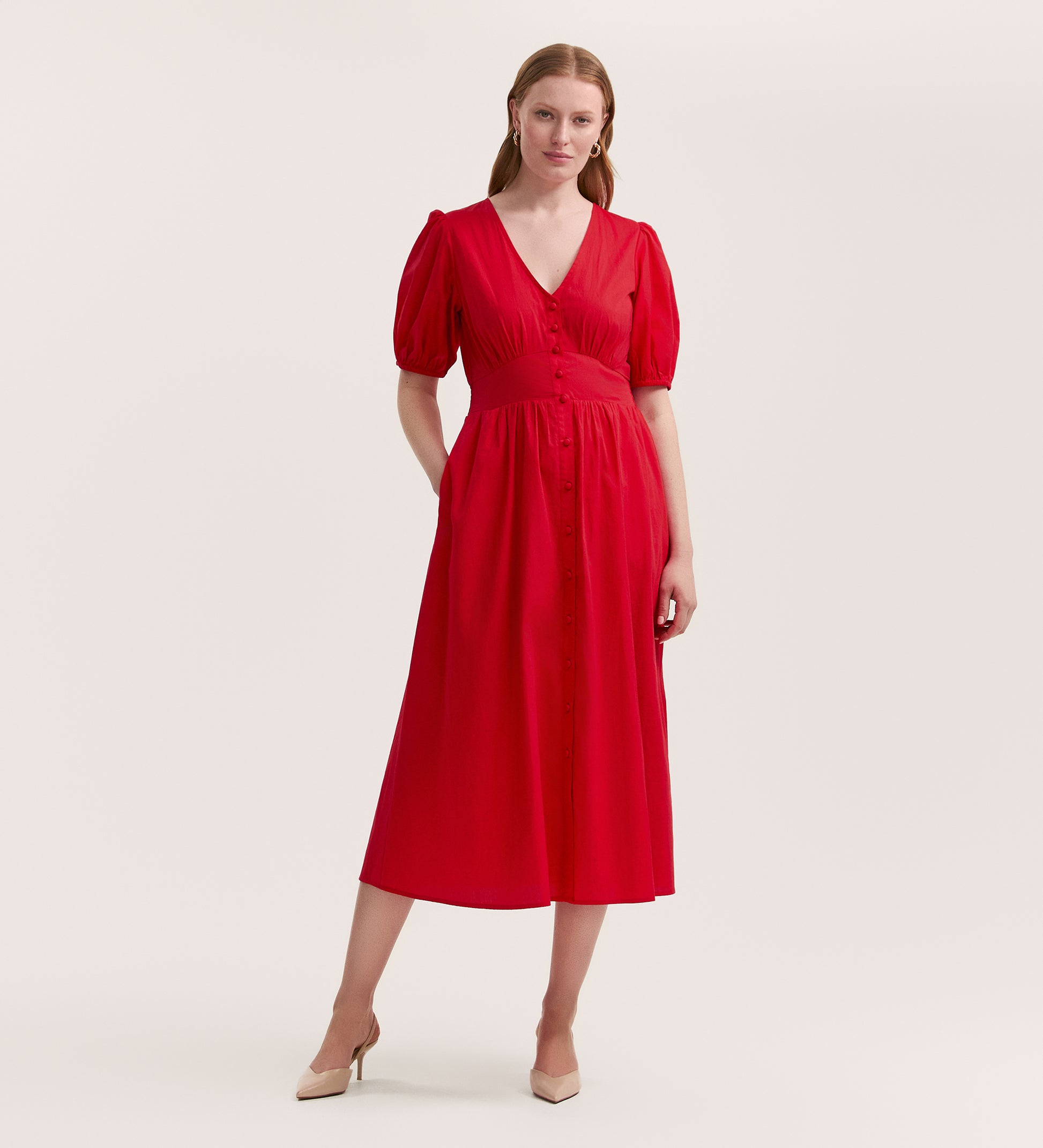 Addison is a red v-neck midi tea dress crafted from our cotton seersucker fabric. With short puff sleeves, button-down front and a waist seam, she's a flattering yet stylish addition for every wardrobe.