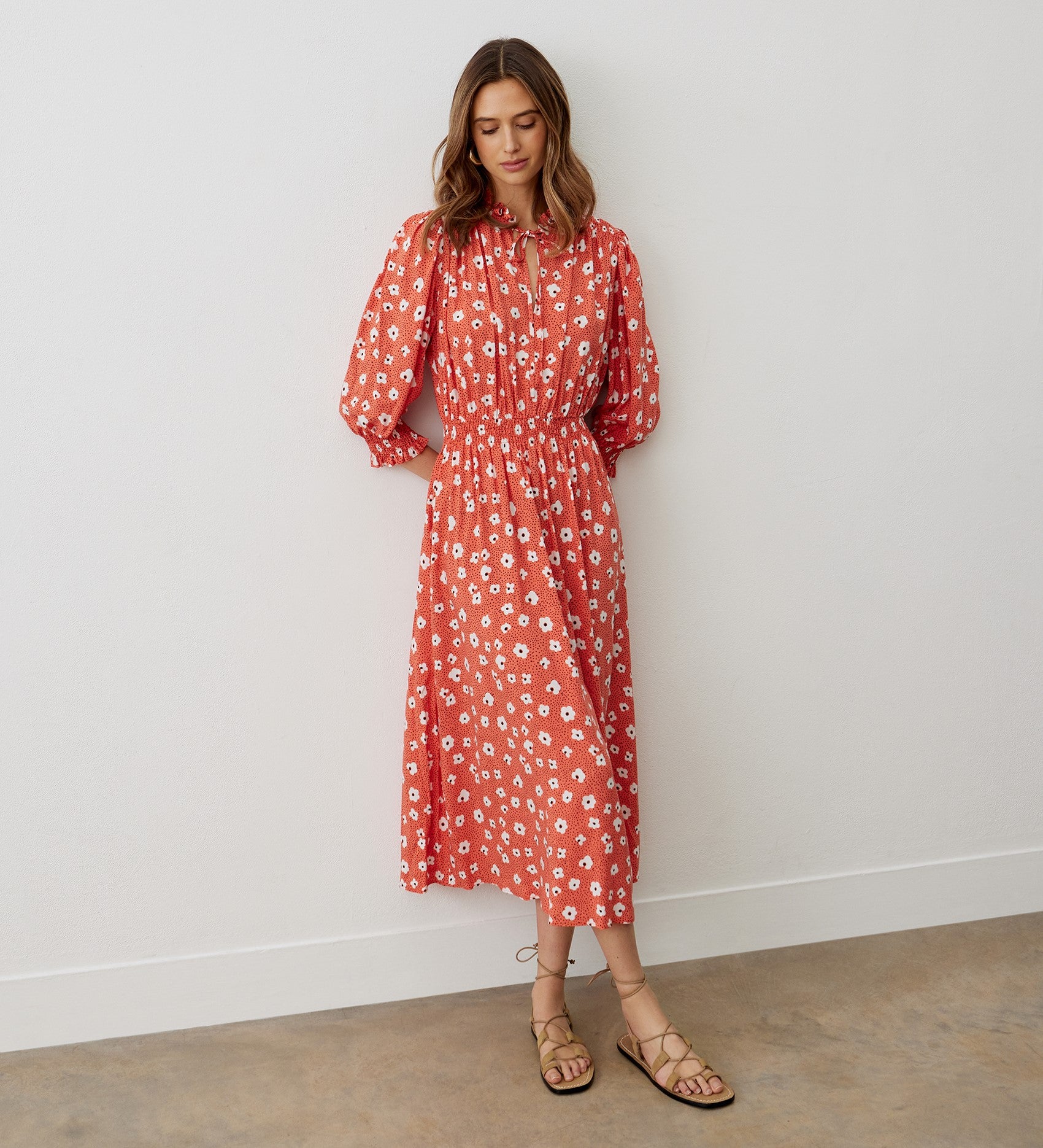 A ditsy midi dress is a wardrobe essential for the warmer weather. Agyness features plenty of feminine details, including shirred waist detail, shirred cuffs, and shirred shoulder detail. Note also the blouson three-quarter length sleeves and notch neckline with tie detail.