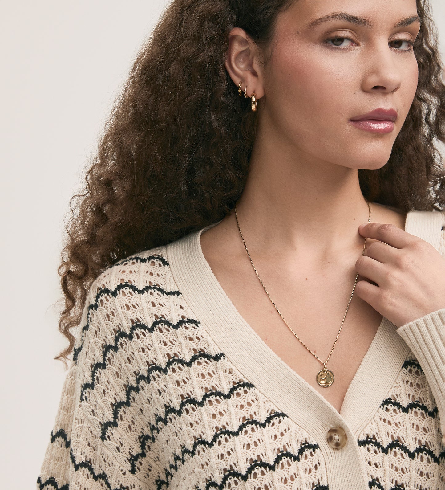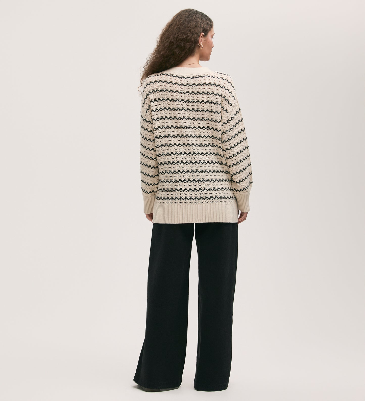 Effortlessly chic, Alena is an ivory oversized crochet cardigan in a striped zig-zag design. With a relaxed fit, she features a v-neck, long sleeves and a button-up front. Note also the ribbed detail on both the cuffs and hemline.