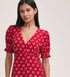Alia is a red polka dot button-down midi dress crafted from our crease-free crepe fabric. She features short puff sleeves with elasticated cuffs and a feminine v-neck.