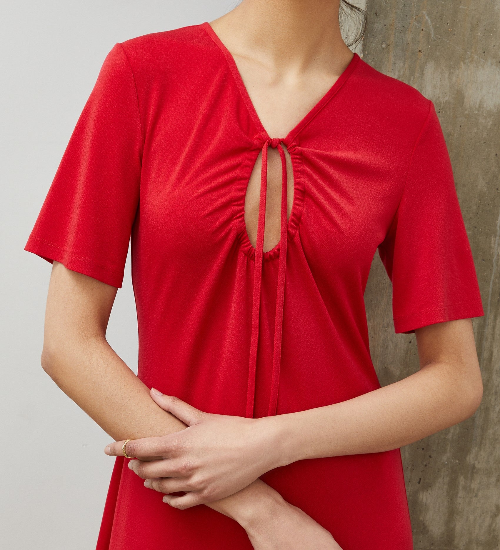 An every season must-have, Alice is a midi dress crafted from jersey crepe. Short sleeves and an on-trend front cut out make Alice the perfect dress for warmer weather. We also love the elasticated tie detail that can be adjusted to make the cut out detail smaller or larger.