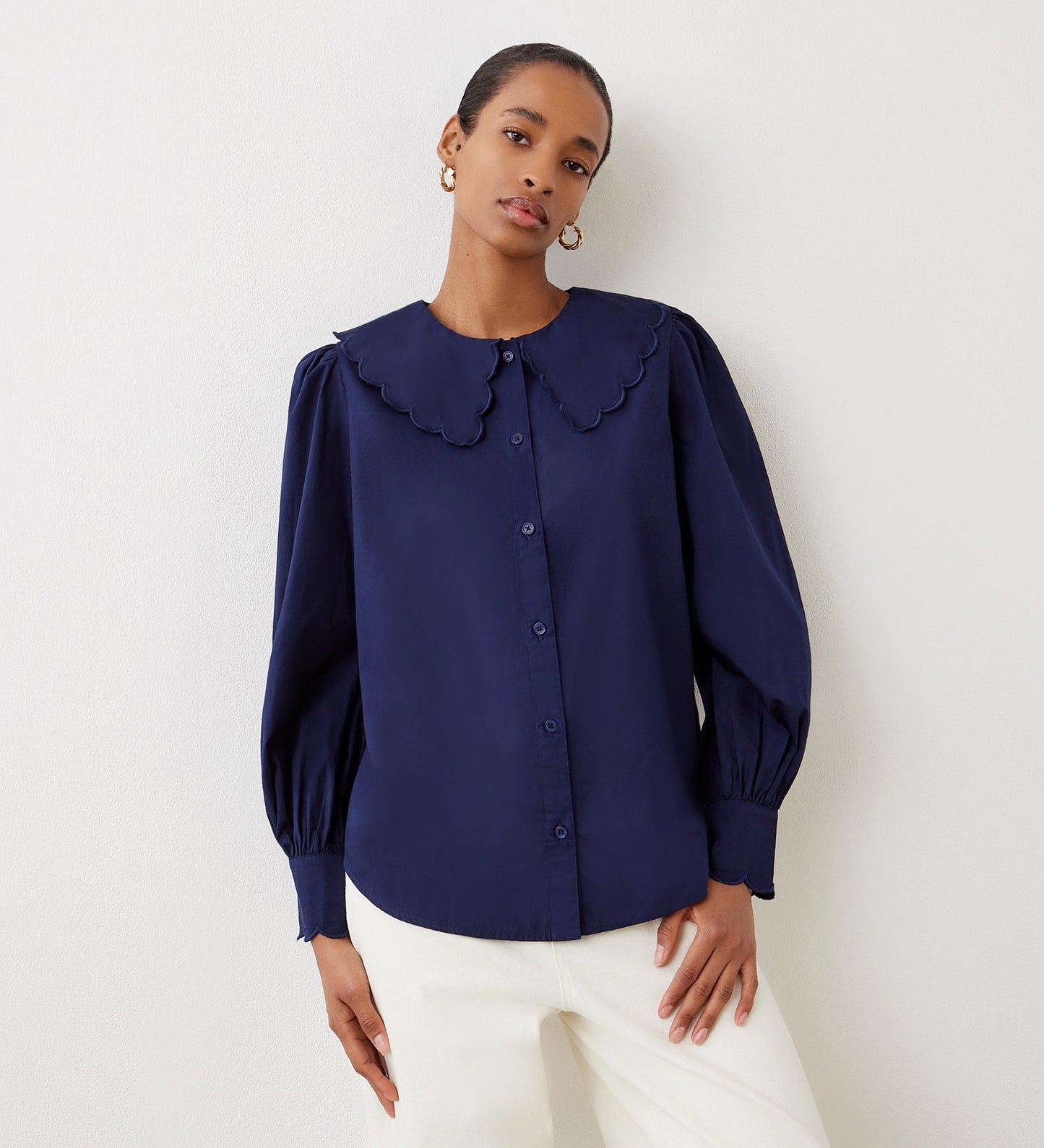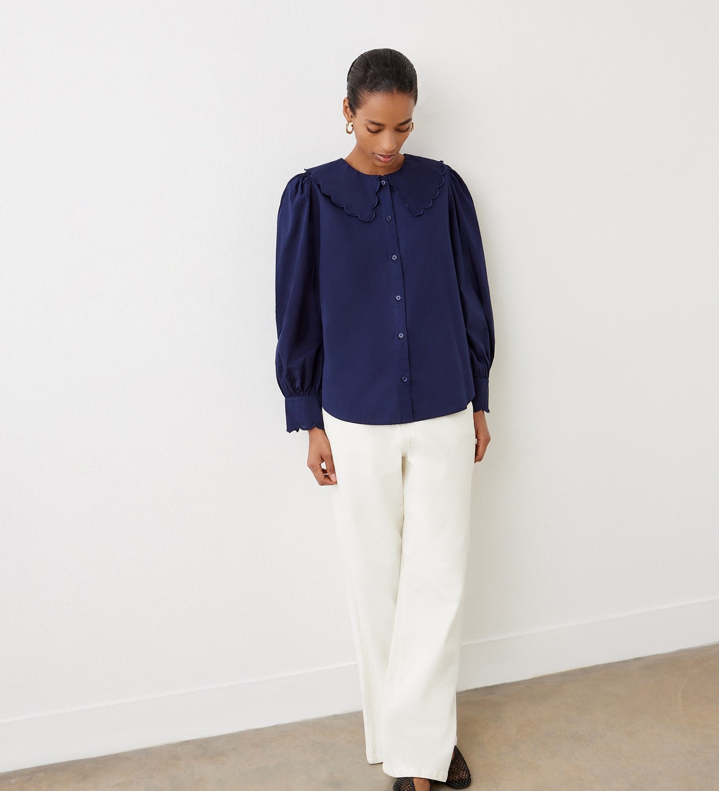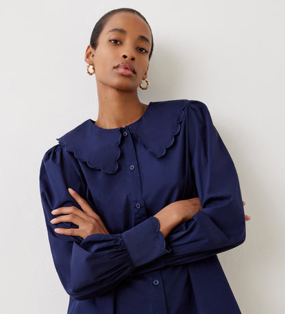 A navy regular-fit cotton shirt with an oversized scallop edge Peter Pan collar, Amadine also features blouson long sleeves with deep cuffs and scallop edge detail.