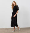 Crafted from lightweight georgette, Amelia is a lined round neck midi dress with textured spot detail. She also features a shirred bodice that gathers at the waist, a tiered hemline and short blouson sleeves with shirred cuffs and ruffle detail. Note also the ruffle detail on the neck. For a flattering shape, Amelia has an invisible side zip and a rear keyhole and button fastening.