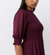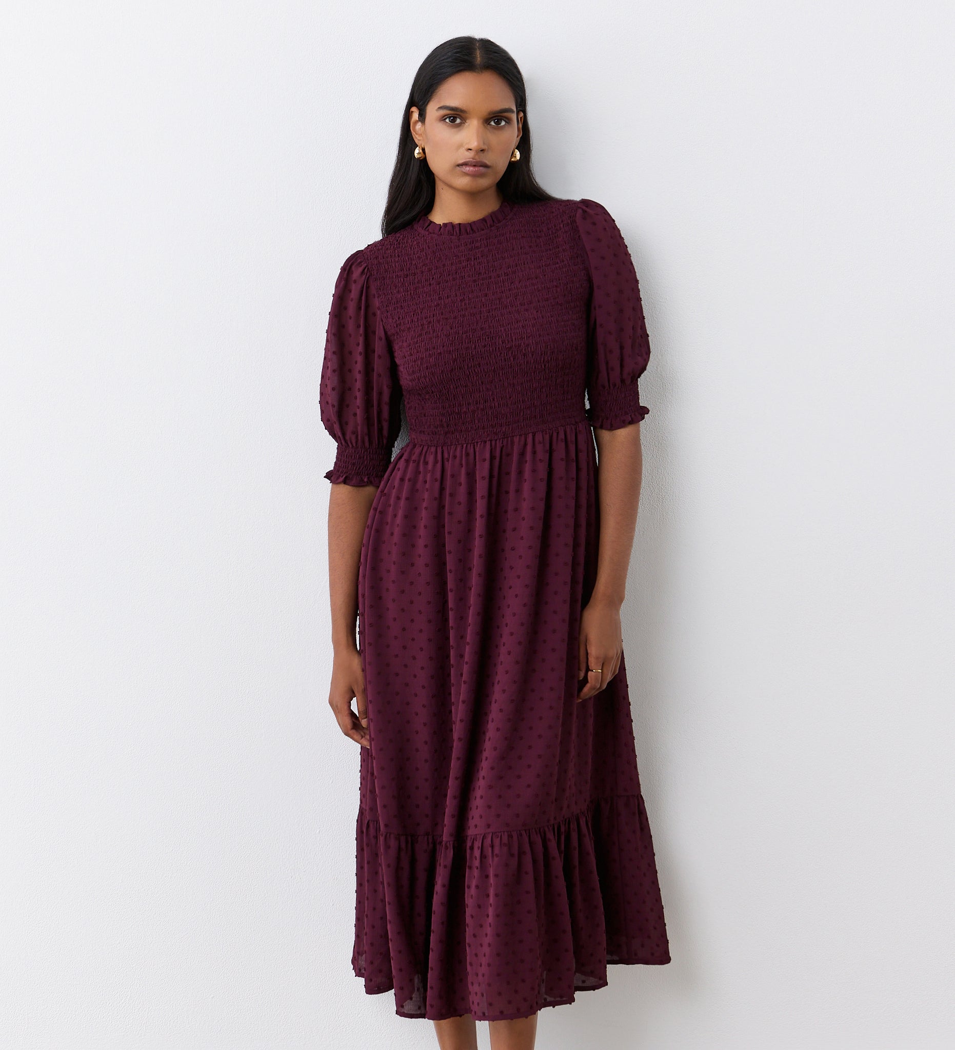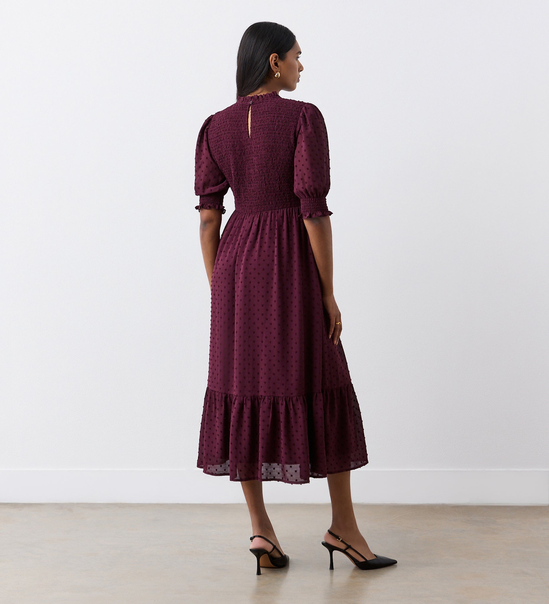 Crafted from lightweight georgette, Amelia is a lined round neck midi dress with textured spot detail. She also features a shirred bodice that gathers at the waist, a tiered hemline and short blouson sleeves with shirred cuffs and ruffle detail. Note also the ruffle detail on the neck. For a flattering shape, Amelia has an invisible side zip and a rear keyhole and button fastening.