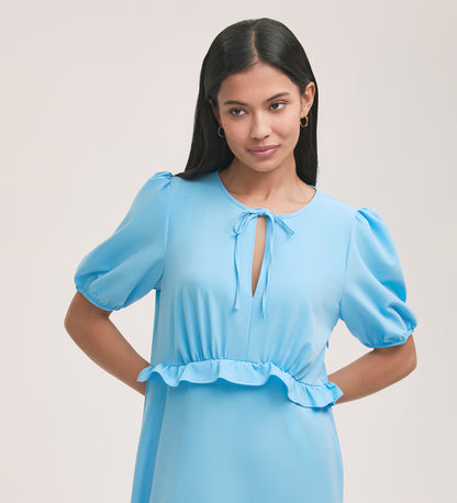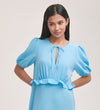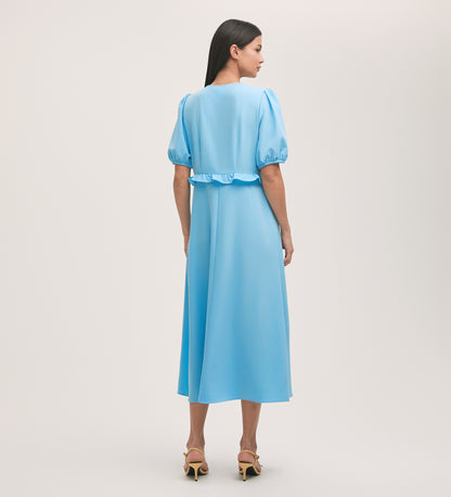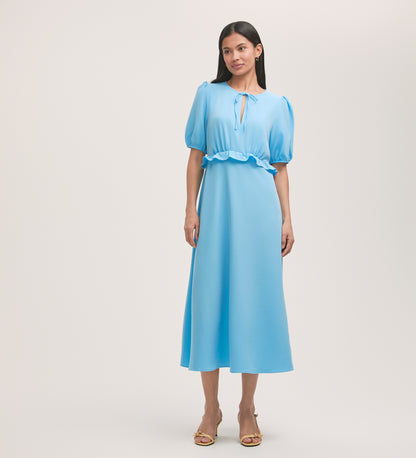 A feminine light blue midi tea dress with ruffle details, an elegant tie neck and blouson sleeves. Anika is a classic midi length cut crafted from our crease-free crepe.