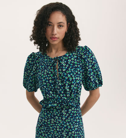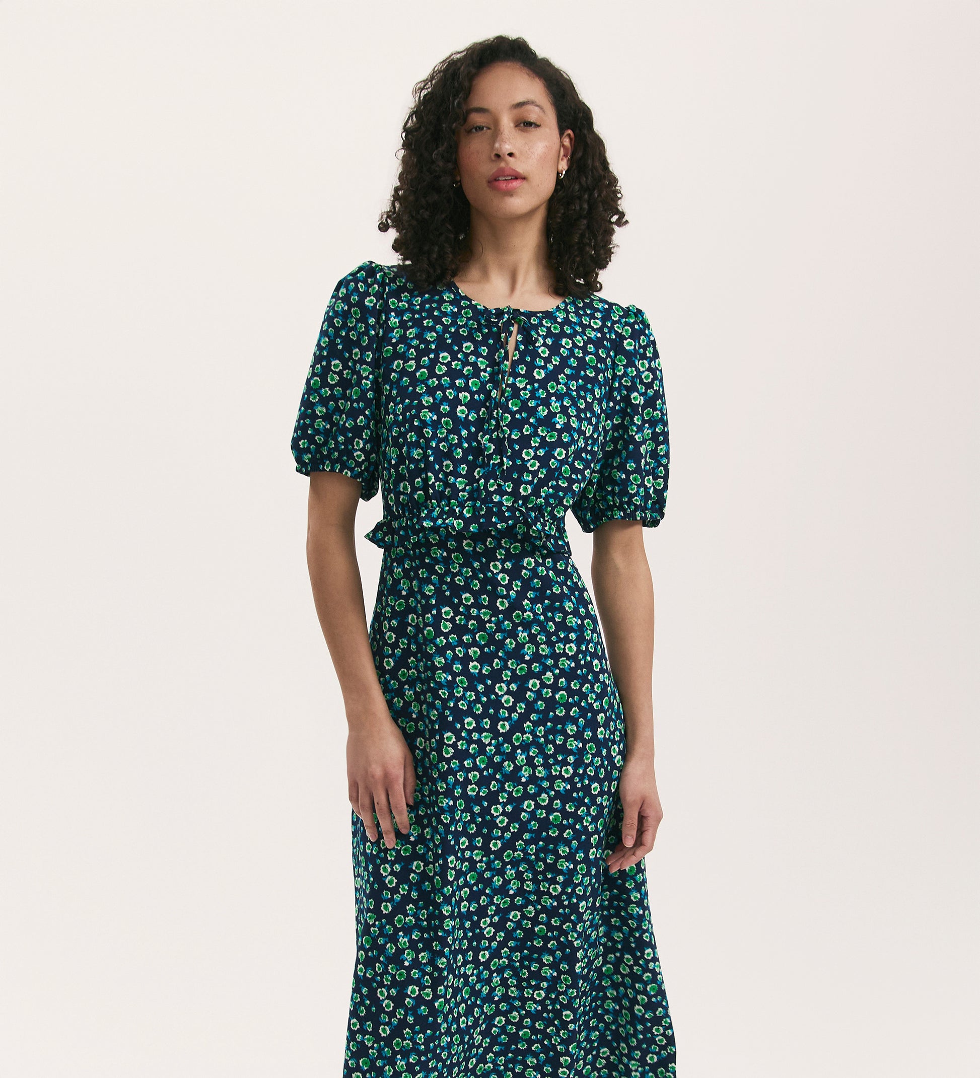 A feminine navy ditsy floral midi tea dress with ruffle details, an elegant tie neck and blouson sleeves, Anika is a classic midi length cut crafted from our crease-free crepe.