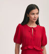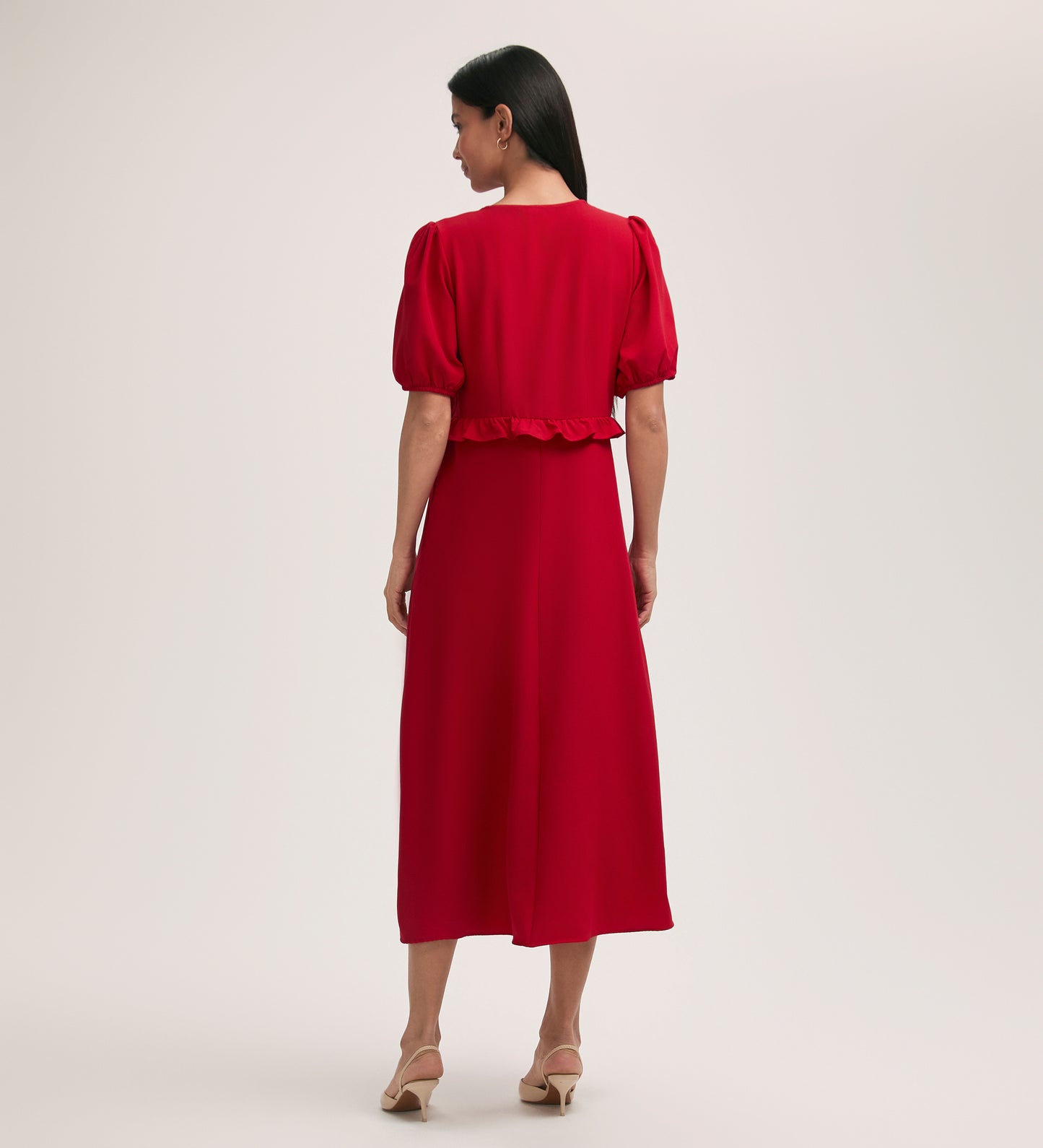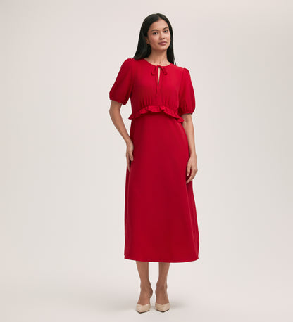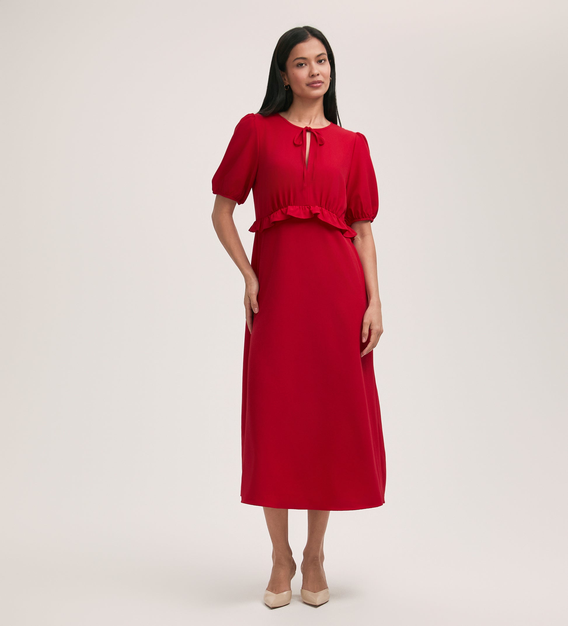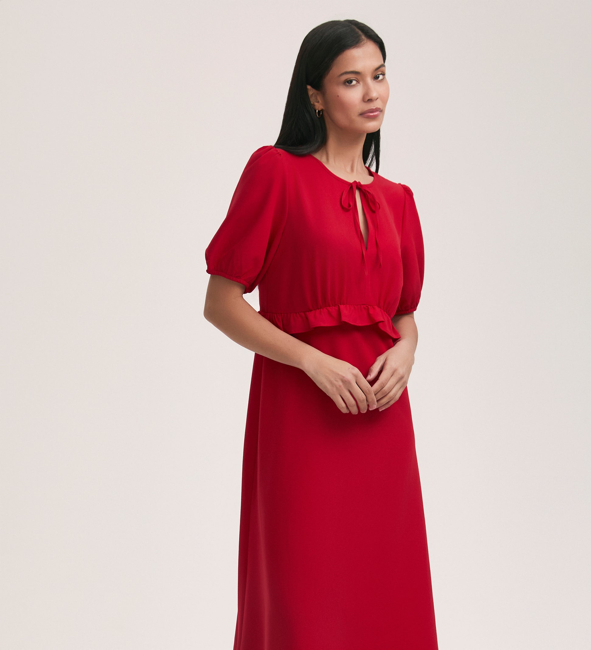A feminine red midi tea dress with ruffle details, an elegant tie neck and blouson sleeves. Anika is a classic midi length cut crafted from our crease-free crepe.