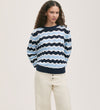 In a wavy striped design, Antonia is a navy and light blue crochet jumper with long sleeves and dropped shoulders for a relaxed fit. She also features ribbed detail on the cuffs, hem and neckline.