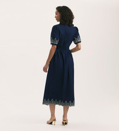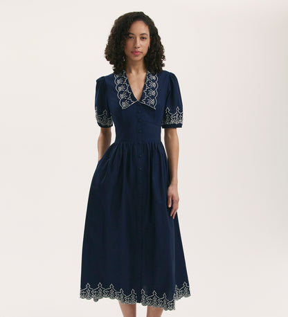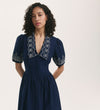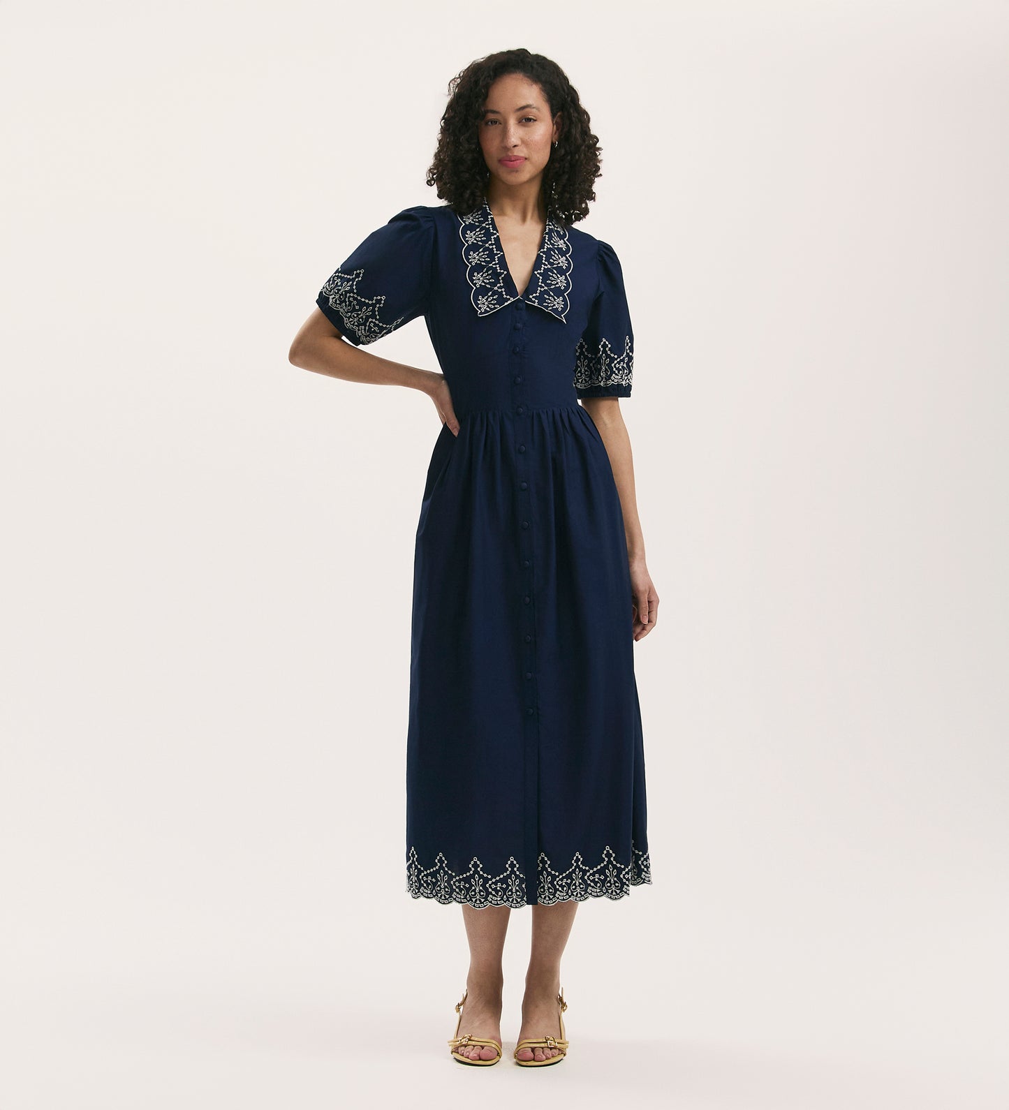 With gorgeous embroidered detail at the collar, sleeves and hemline, Arianna is a navy button-down midi dress, crafted from cotton. She features short puff sleeves and a waist panel that gathers at the bust for a flattering fit.