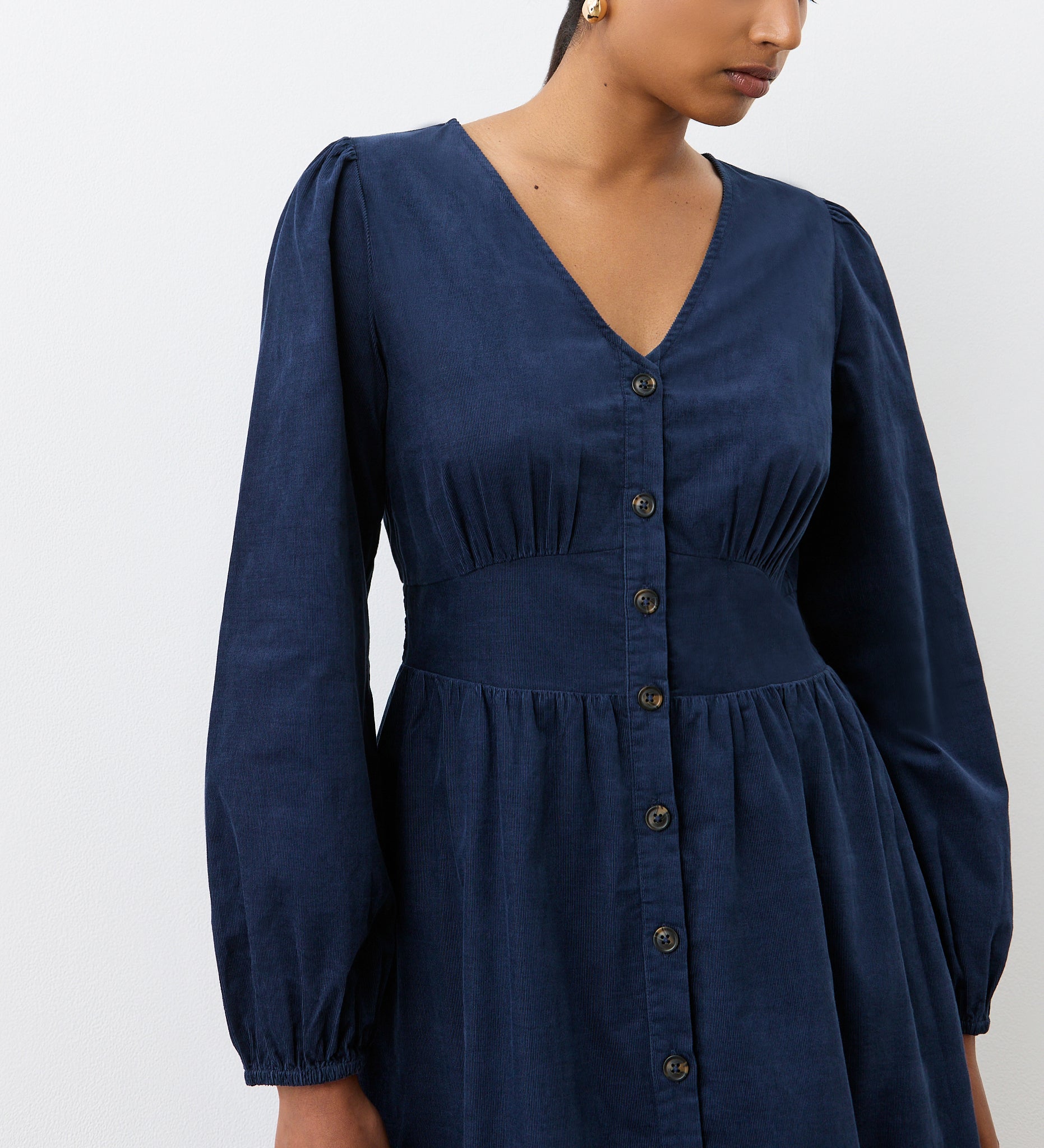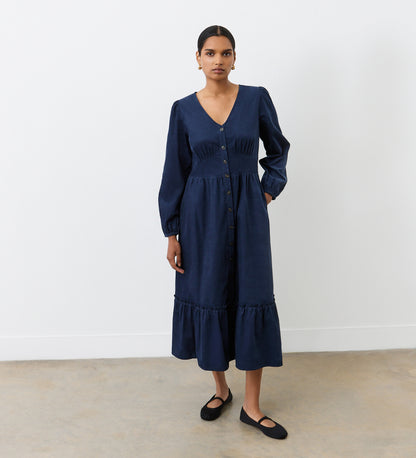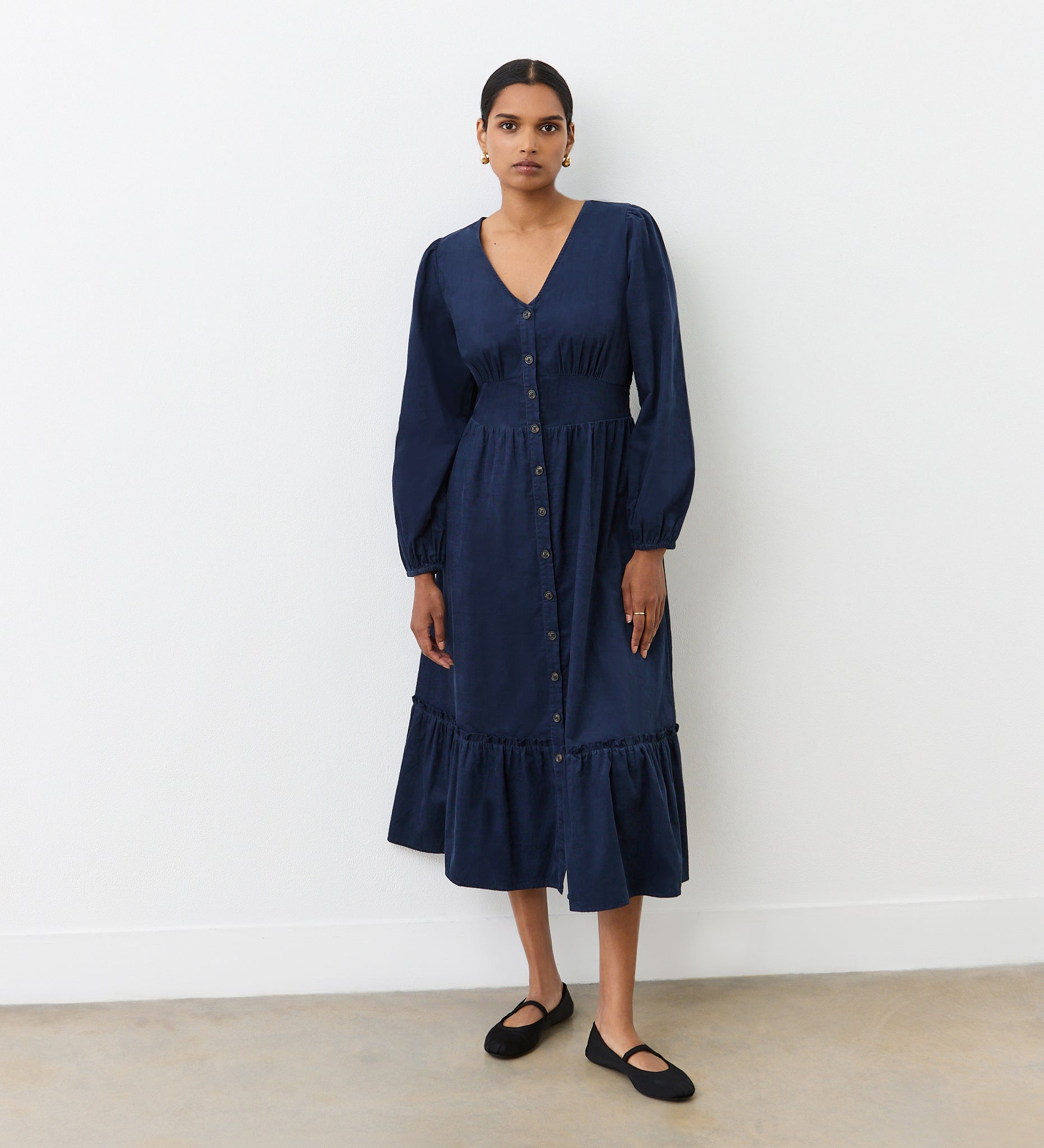 Crafted from corduroy, Arizona is a button-through midi dress with a tiered hemline, functional pockets and a flattering empire shaped waistband. Long elegant sleeves flow into elasticated cuffs and rear shirring detail helps to flatter the figure.