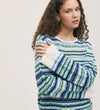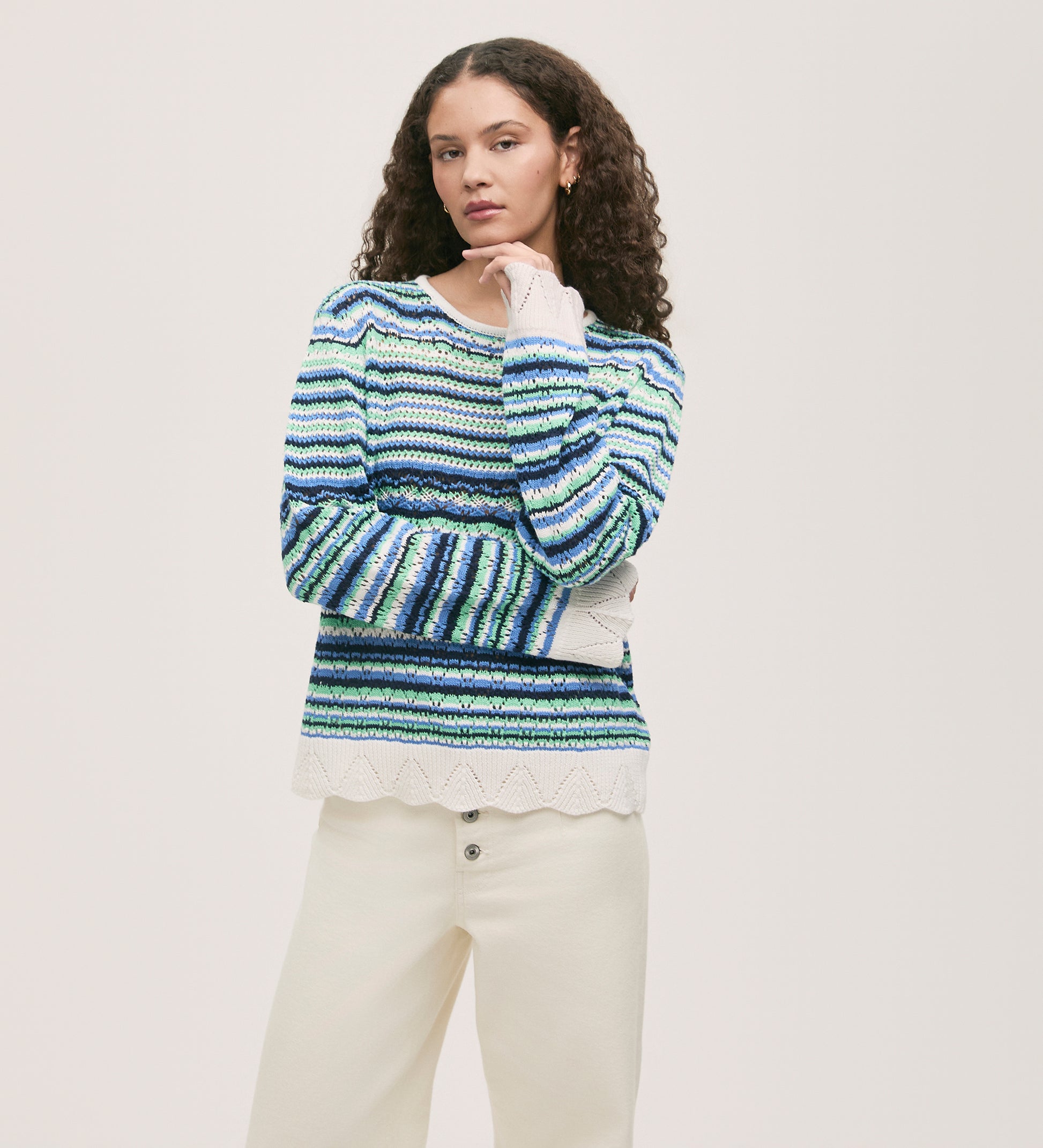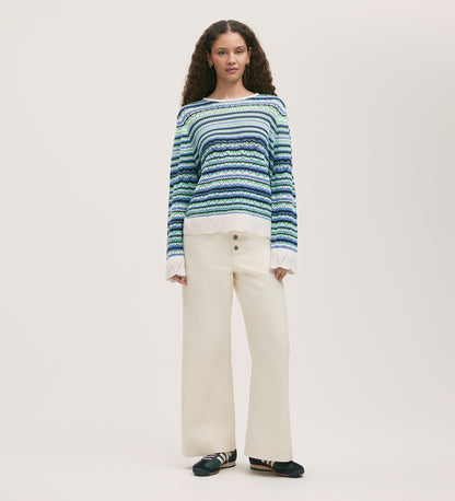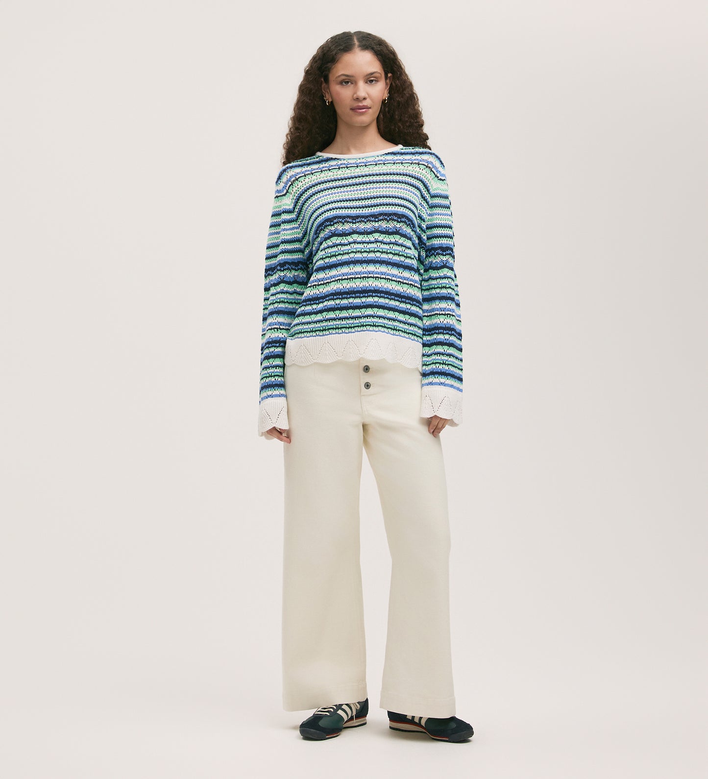 With scallop ribbed detail at the hemline and cuffs, Audrenia is a blue striped crochet jumper with long sleeves and dropped shoulders for a relaxed fit.