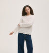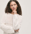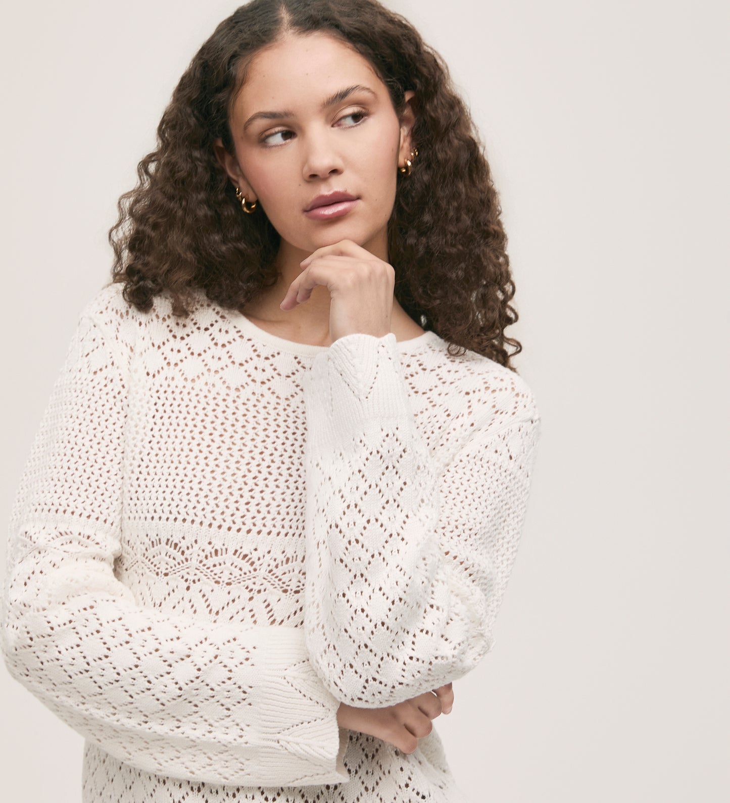 With scallop ribbed detail at the hemline and cuffs, Audrenia is an ivory white crochet jumper with long sleeves and dropped shoulders for a relaxed fit.