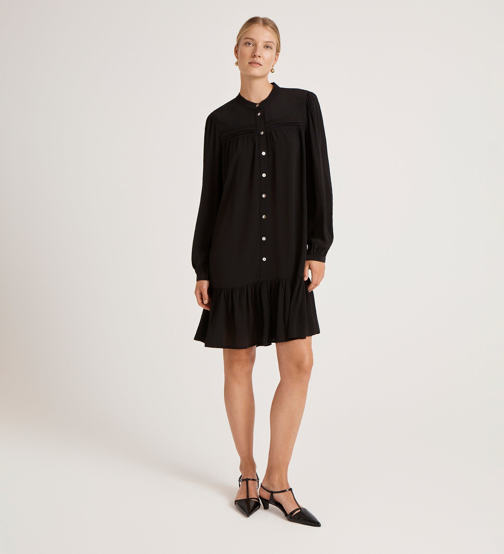 Beccy is a charming mini dress that exudes vintage-inspired elegance. Featuring a delicate mandarin collar and faux mother-of-pearl buttons, she's adorned with pintuck and lace trim details for a subtle, feminine touch. Long puff sleeves with buttoned cuffs complement the tiered skirt, while lightweight crepe fabric ensures a soft, flowing silhouette. Beccy is the perfect piece to bring effortless romance to both everyday and special occasion looks.