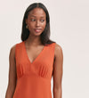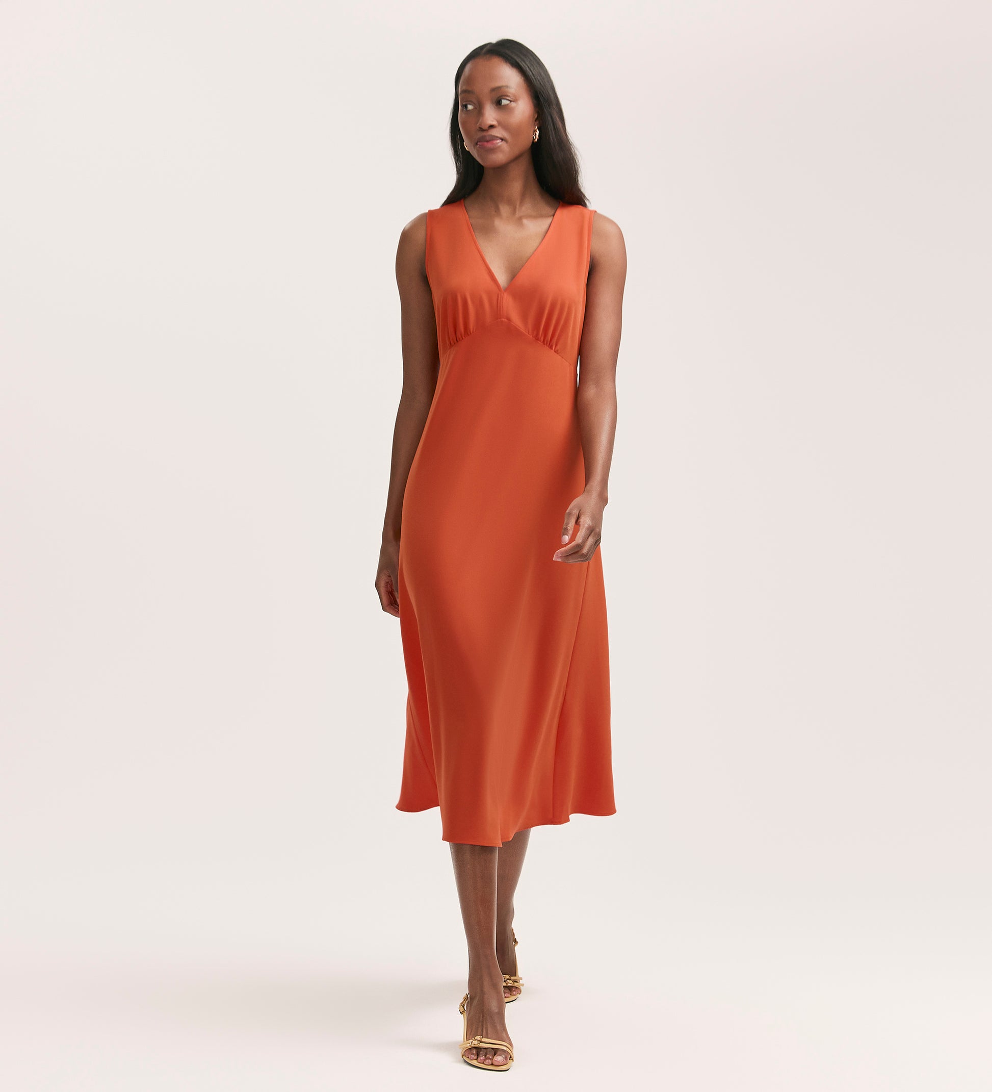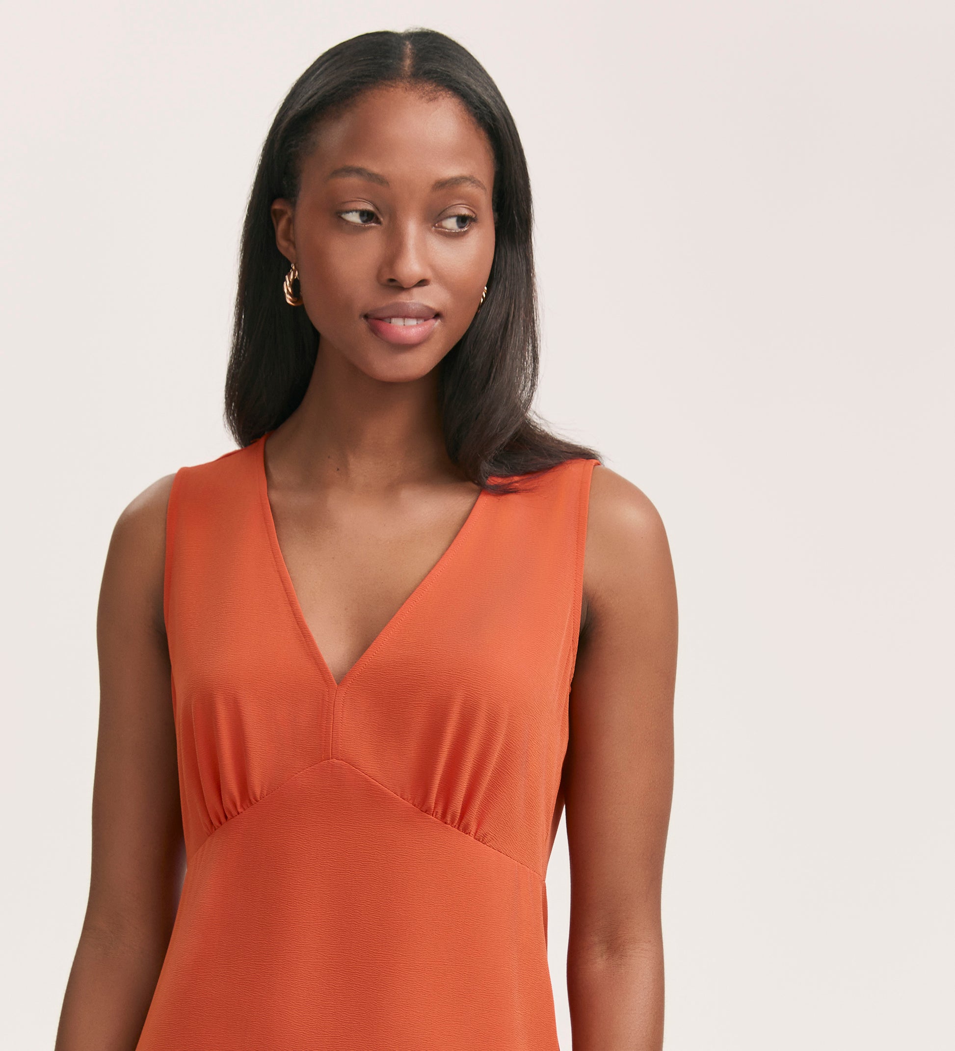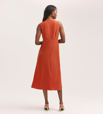 Simple and sleek, Brionie is an orange sleeveless midi dress crafted from our crease-free crepe fabric. Featuring a flattering v-neck, a waist seam and a gathered bust, she promotes an effortlessly flattering style.