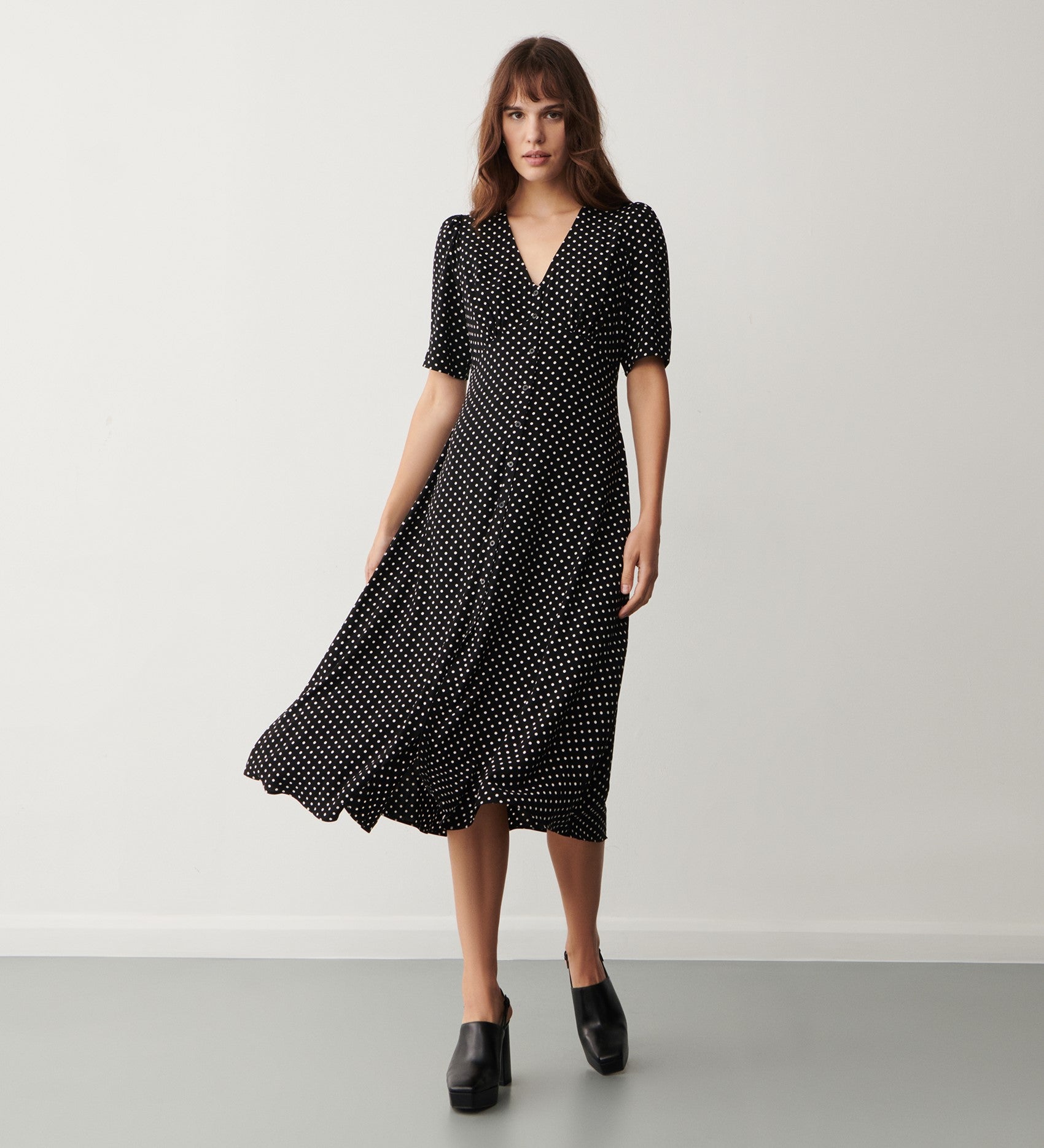A throw-on dress is the go-to outfit for an easy breezy look. A classic-style tea dress, Camilla is buttoned-through midi dress. Camilla has a flattering waist panel to enhance your silhouette and a gathered bust for an ultra-feminine touch. Featuring short sleeves and a side zip, this dress is an easy-to-wear wardrobe staple.