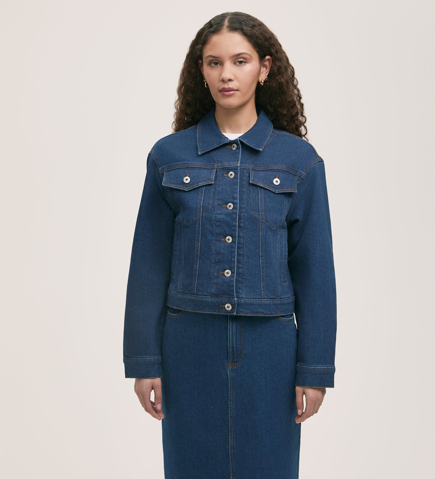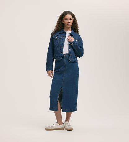 Caroline is our classic mid-wash denim jacket, buttoned up with front patch pockets. A wardrobe essential for every season.