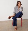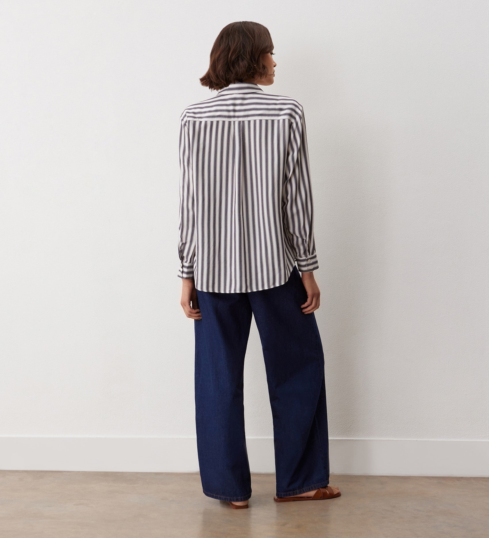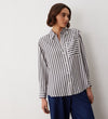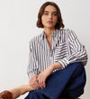 A simple yet stylish wardrobe staple – Celeste is a relaxed fit stripe shirt with long sleeves, front patch pockets and a curved lower back hemline.