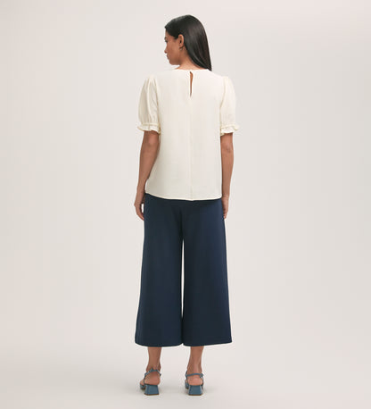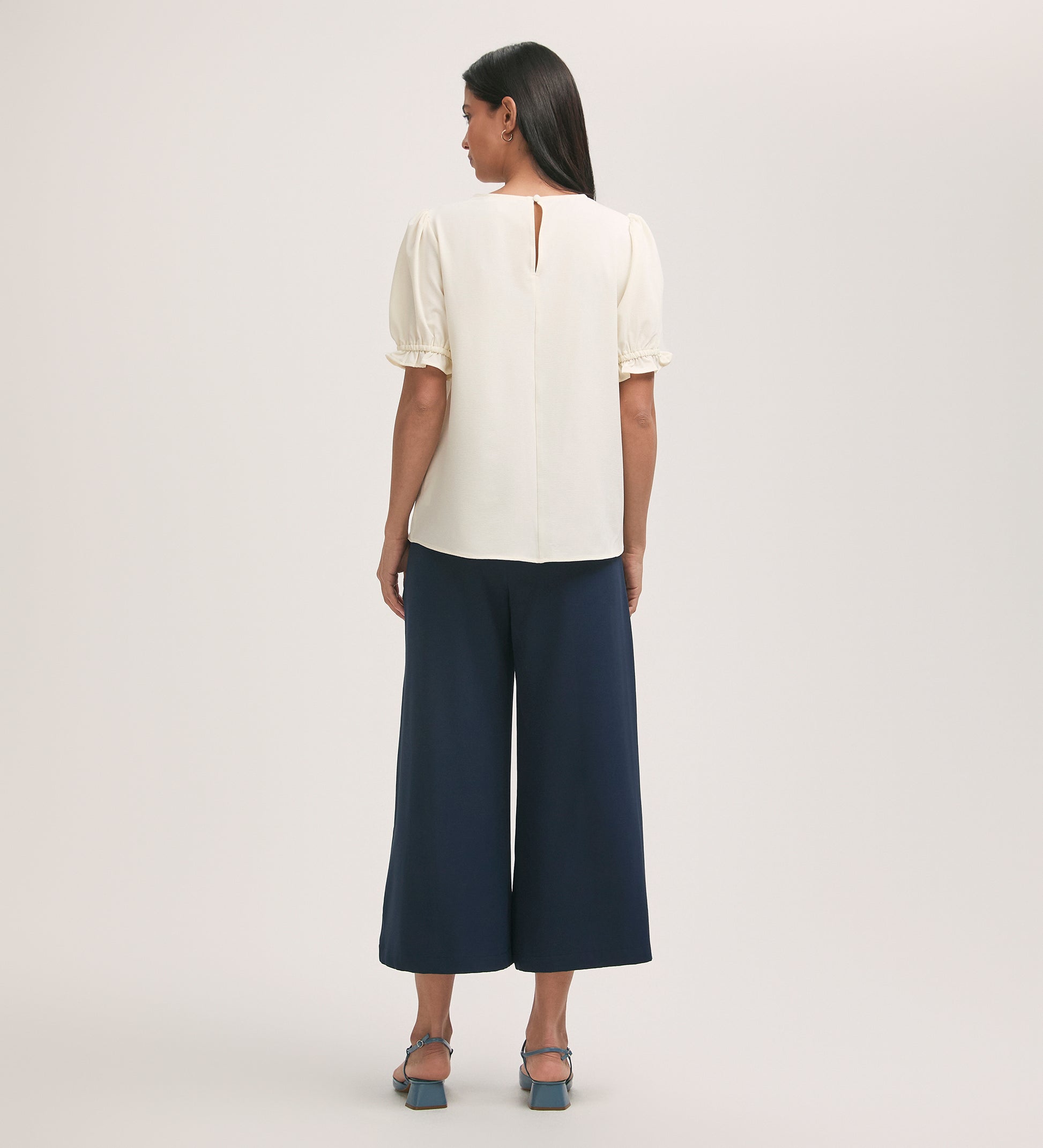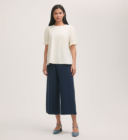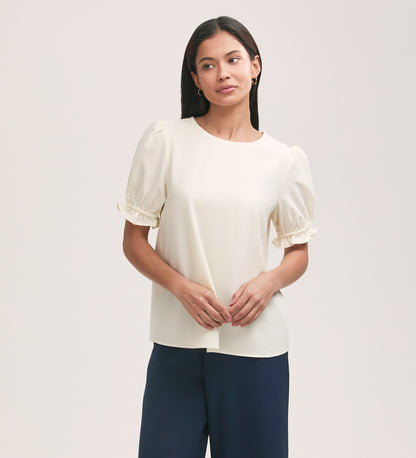 Charlie is an ivory white round neck blouse crafted from our crease-free crepe. Relaxed fit in style, she also features short puff sleeves with frill detail and rear keyhole with button fastening.
