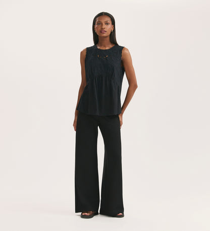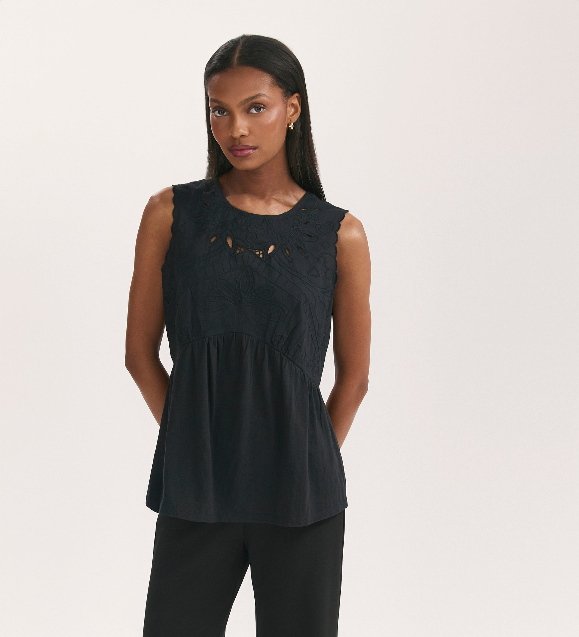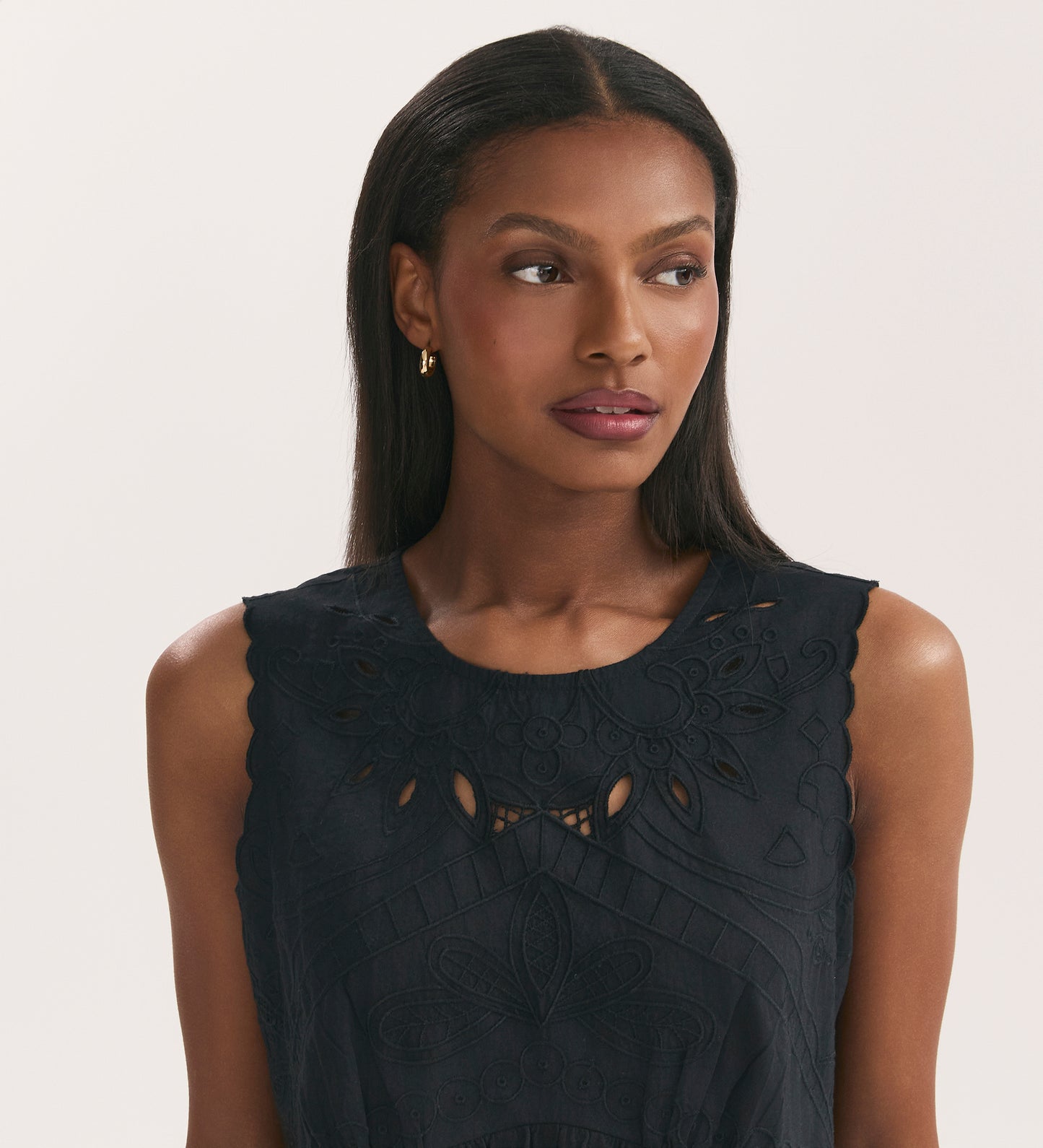 Chrissy is our black sleeveless shell top with cutwork and cotton broderie anglaise detailing. She features a crew neck, scalloped detailed trim on the arms and a rear keyhole opening with button fastening. This easy-to-wear top promises to add endless charm to your wardrobe. Simply pair it with classic denim or a cute skirt for effortless outfitting.