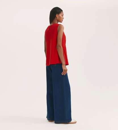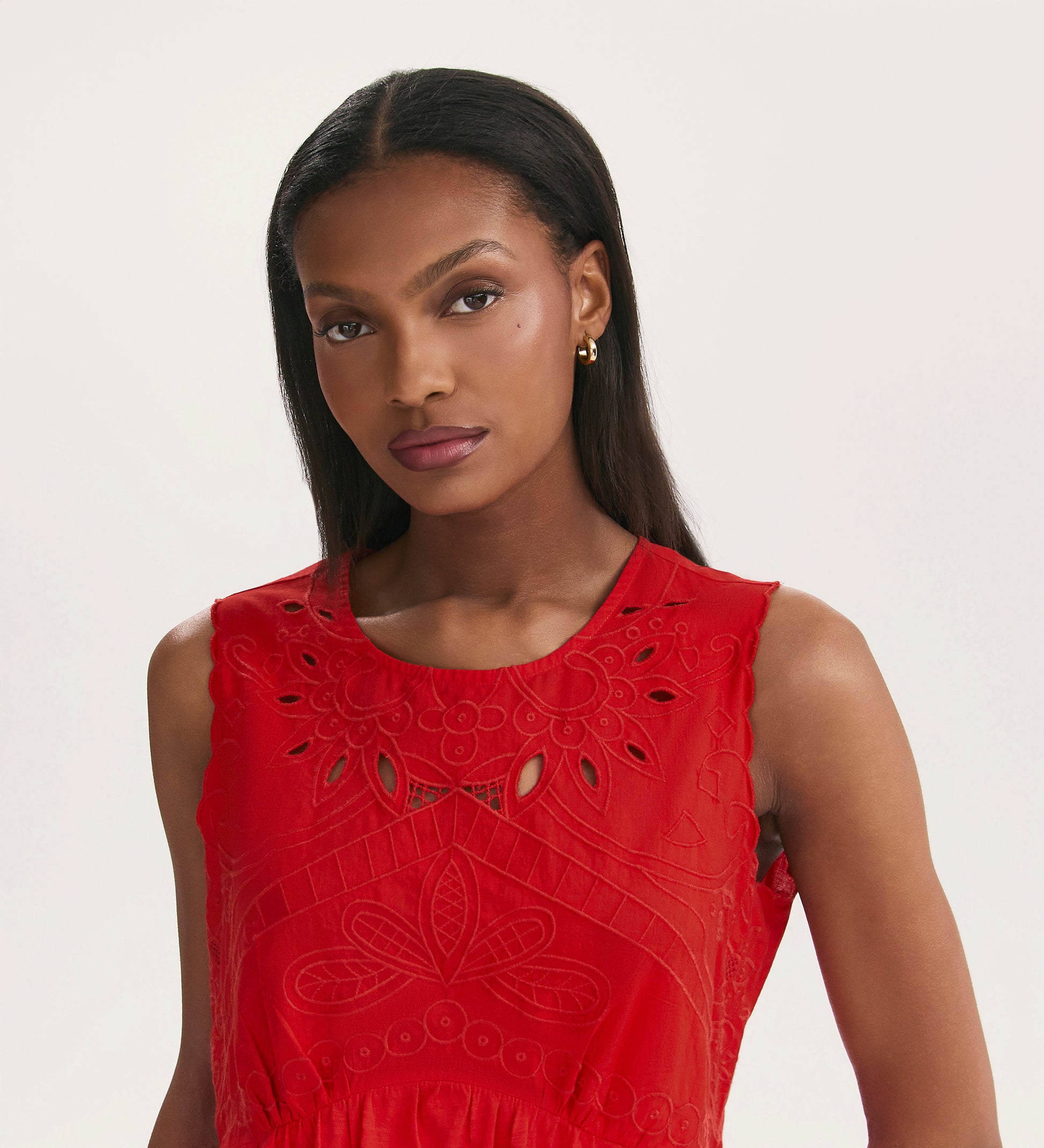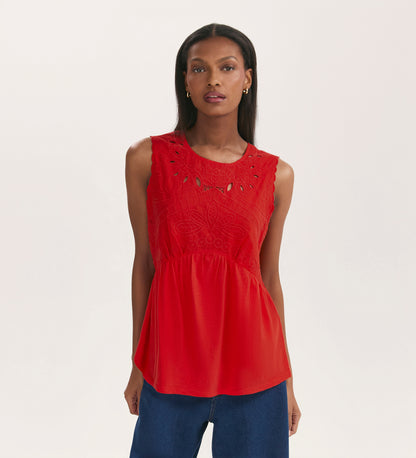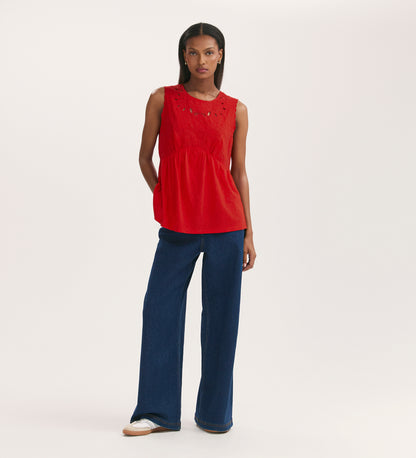 Chrissy is our red sleeveless shell top with cutwork and cotton broderie anglaise detailing. She features a crew neck, scalloped detailed trim on the arms and a rear keyhole opening with button fastening. This easy-to-wear top promises to add endless charm to your wardrobe. Simply pair it with classic denim or a cute skirt for effortless outfitting.
