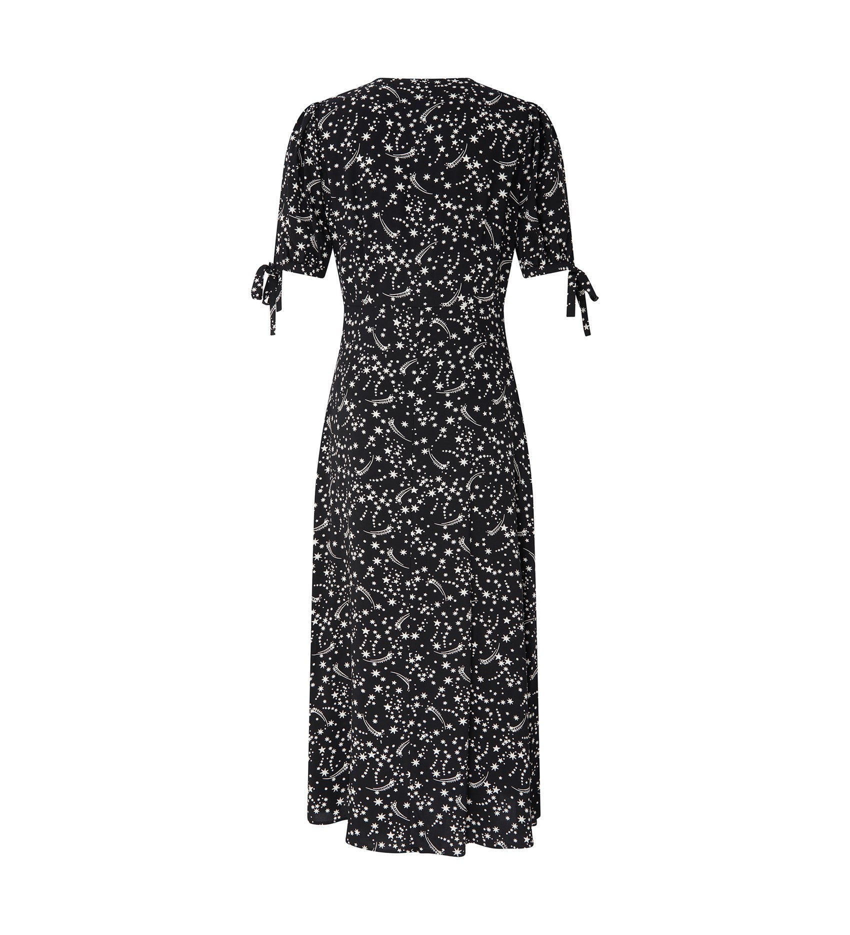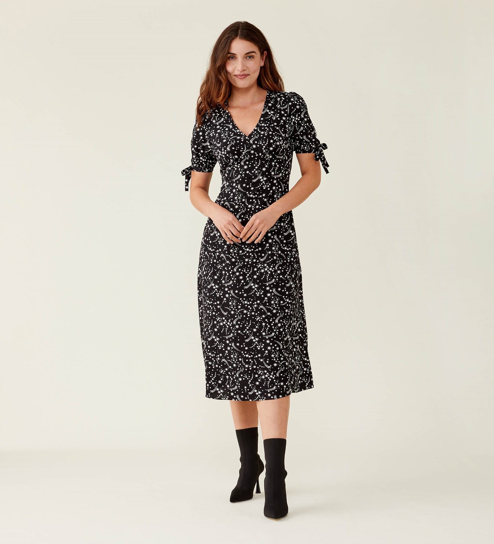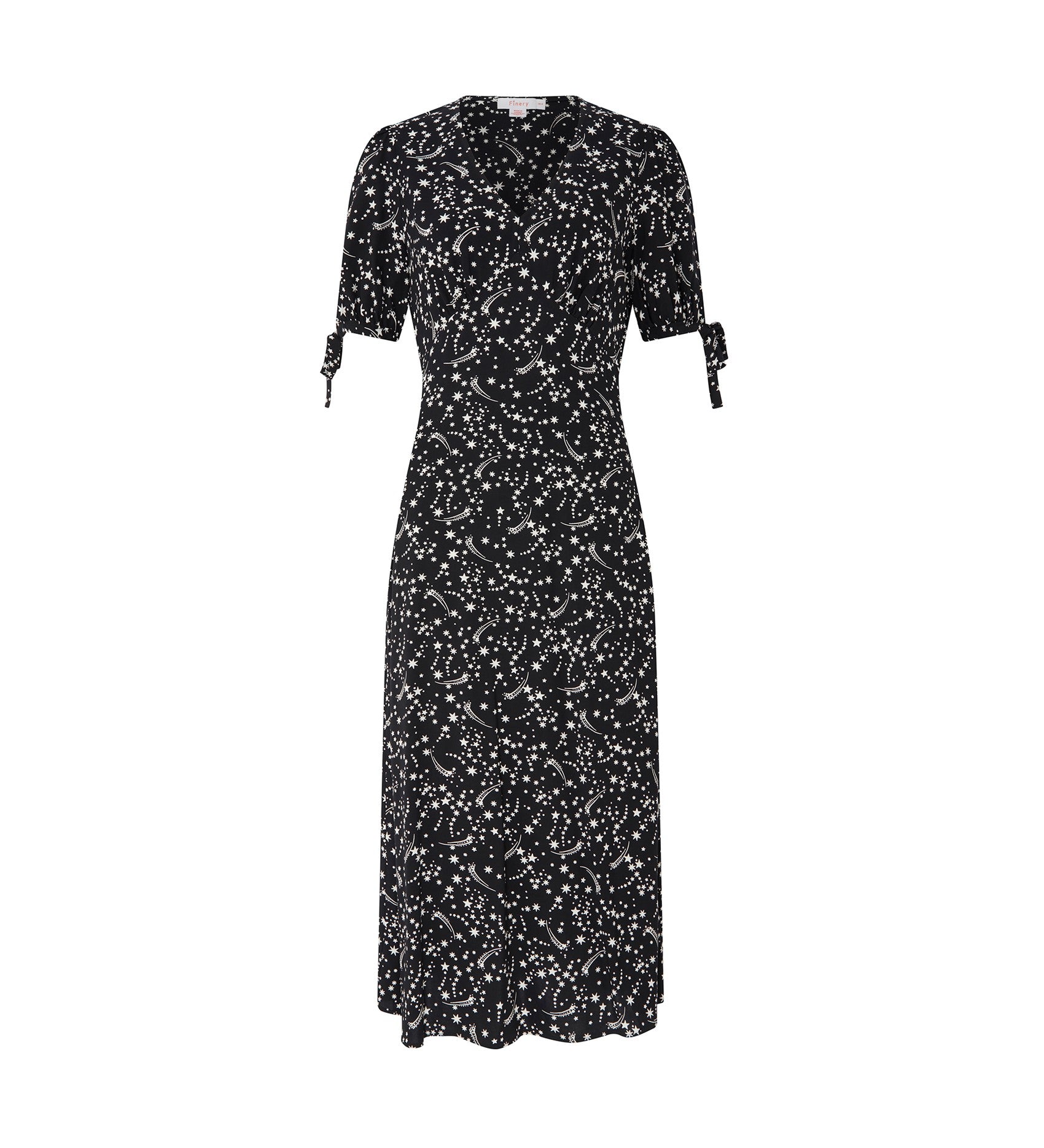 Step into Summer with this pretty calf-length dress, designed with an all-over black stars print and cut to our slightly looser fit for comfort. With a deep v-neckline that leads into an under-bust seam, this feminine dress is designed with voluminous short sleeves with tie detailing. Add boots or flats to complete this playful look.
