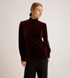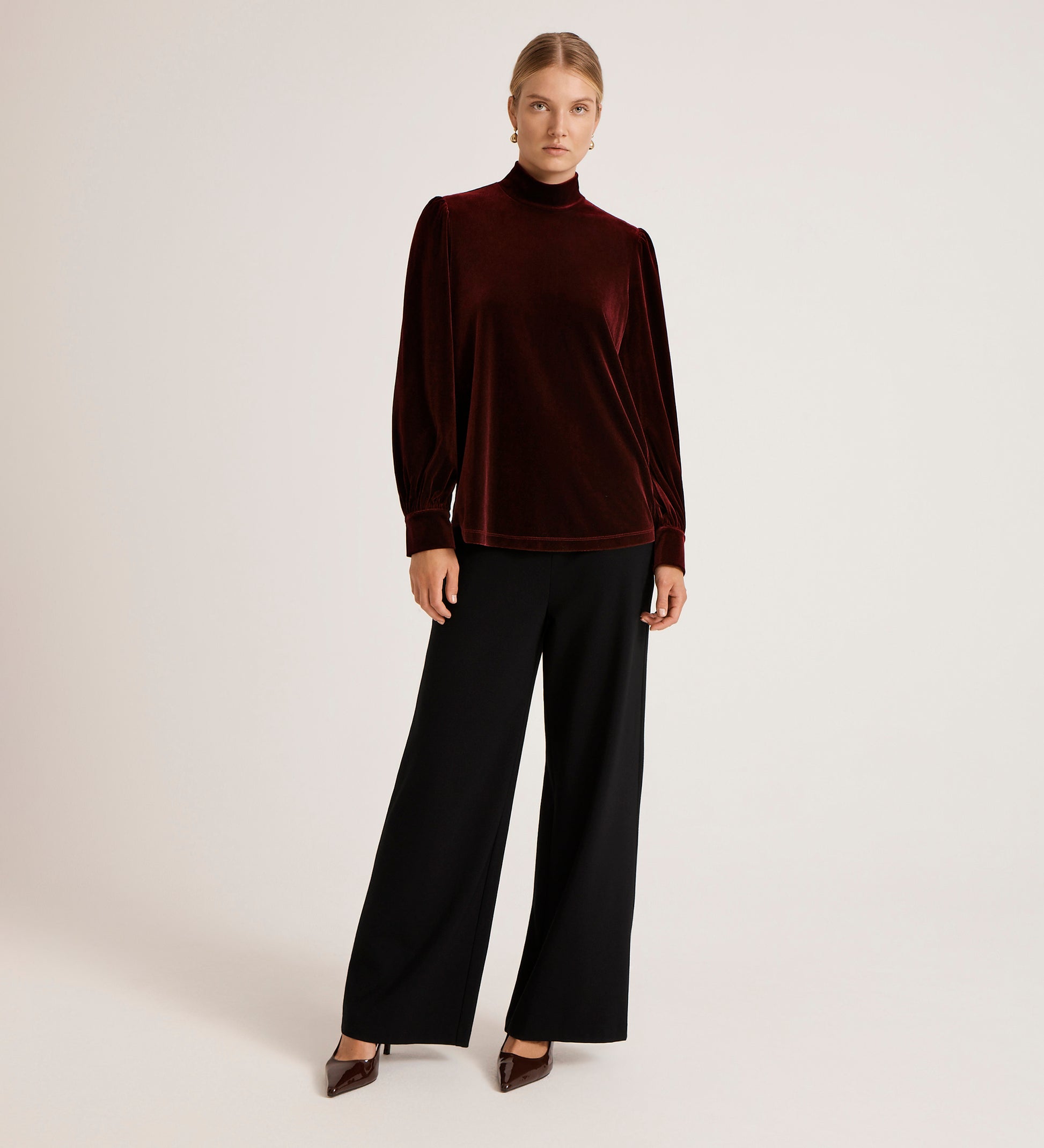 Designed with a high neckline and long puff sleeves finished with cuffs, Clementine is a statement blouse cut to a loose fit for effortless movement. Crafted from soft velvet jersey, she catches the light with gentle lustre, making her an elevated yet versatile choice for both day and evening styling.