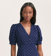 A wardrobe go-to, Colette is a navy polka dot midi tea dress crafted from our crease-free crepe fabric and has short puff sleeves. She also features an empire waist, a feminine v-neck with button detail at the bust.
