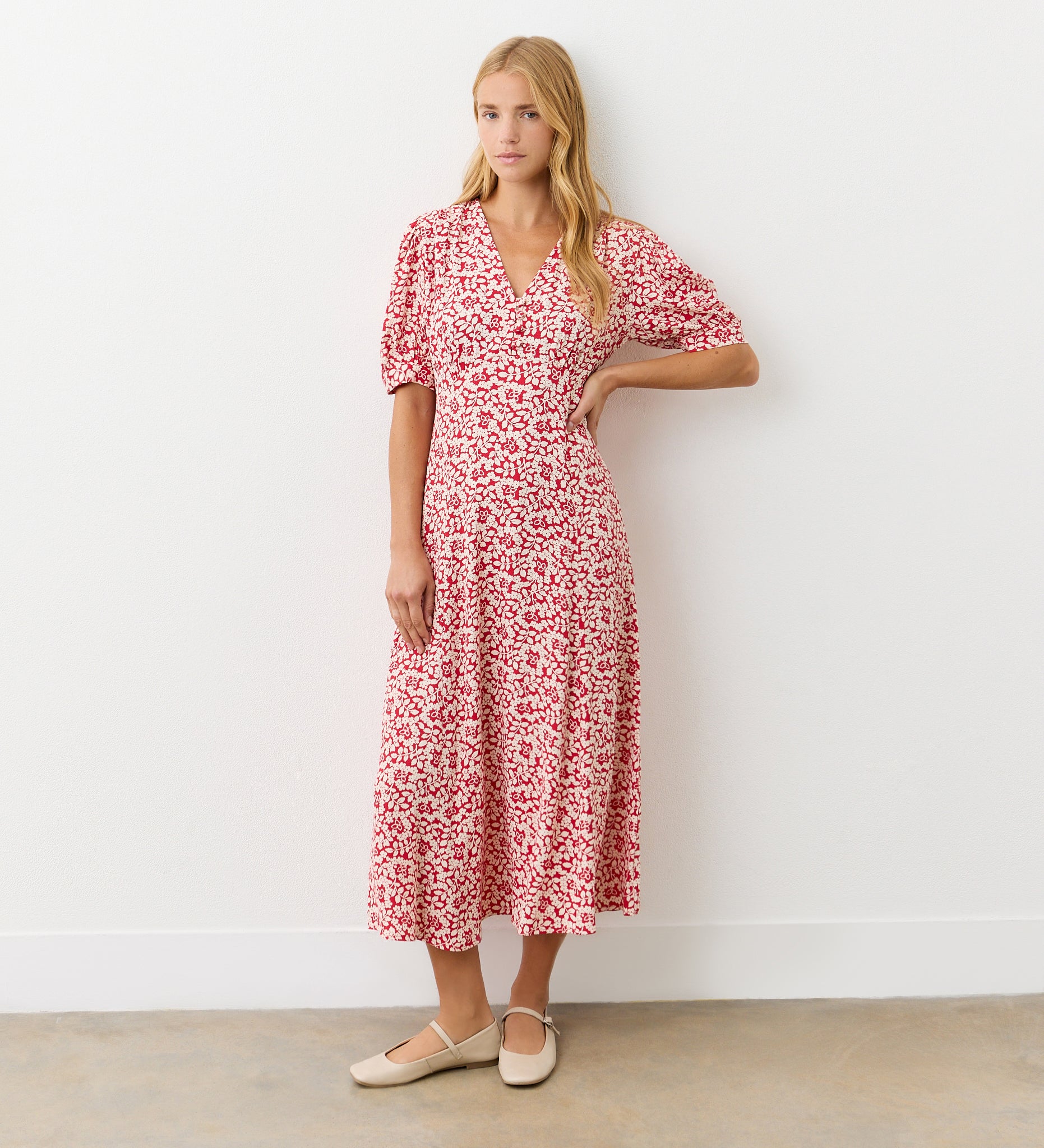A midi-length tea dress with covered front buttons, Colette features a flattering empire waist seam and short puffed sleeves with cuff and button detail. Silhouette enhancing back darts and gathering under the bust add femininity, and the invisible side zip makes it an easy to dress wardrobe staple.