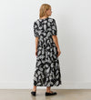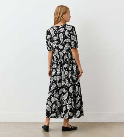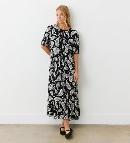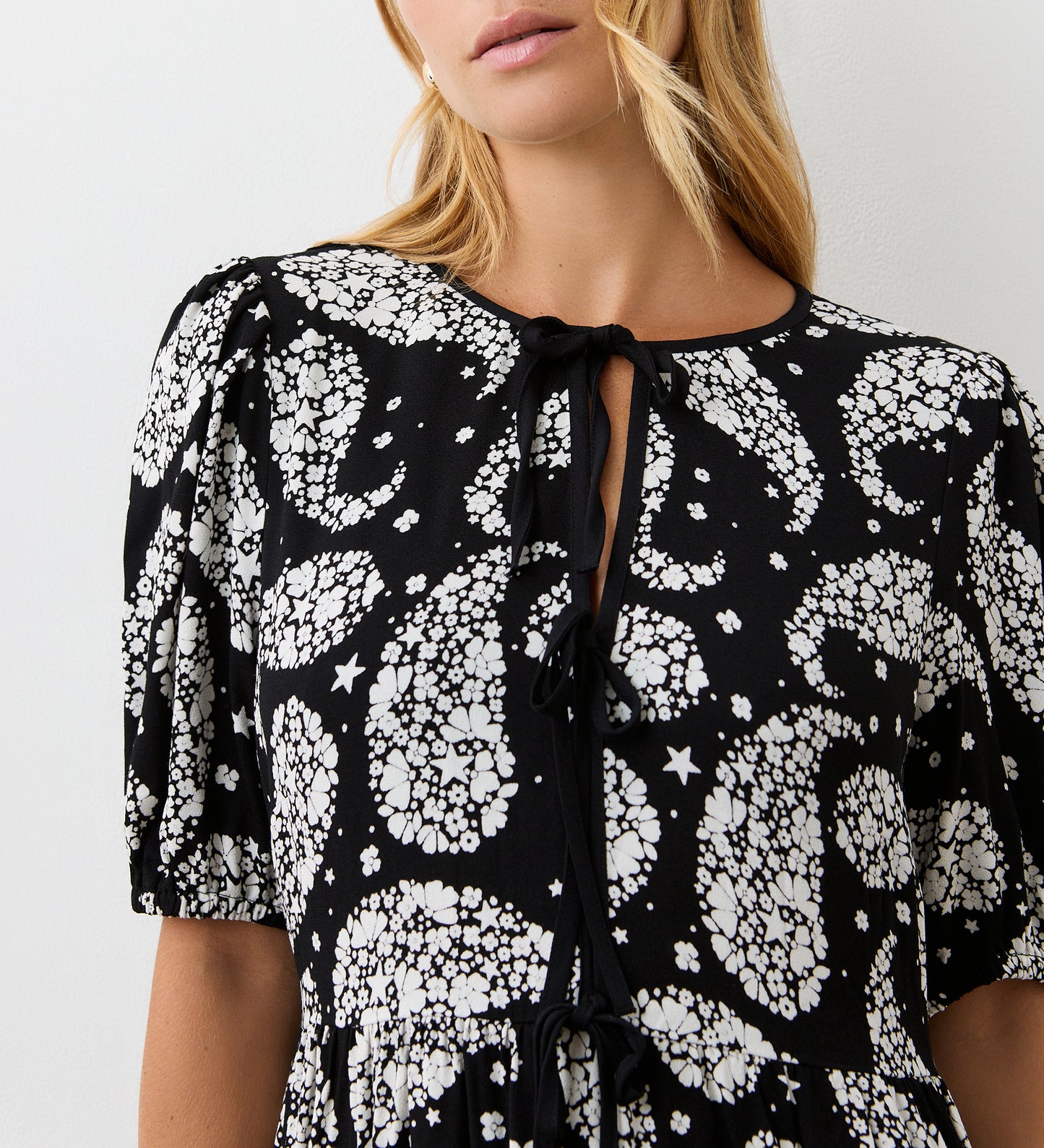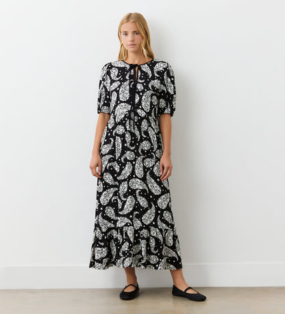 Crafted from our signature crepe and loose fit in style, Cyra is a midi dress perfect for the new season. With short sleeves, she also features a tiered hem, piping detail along the neckline and a tie front.