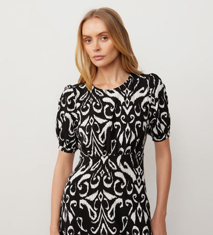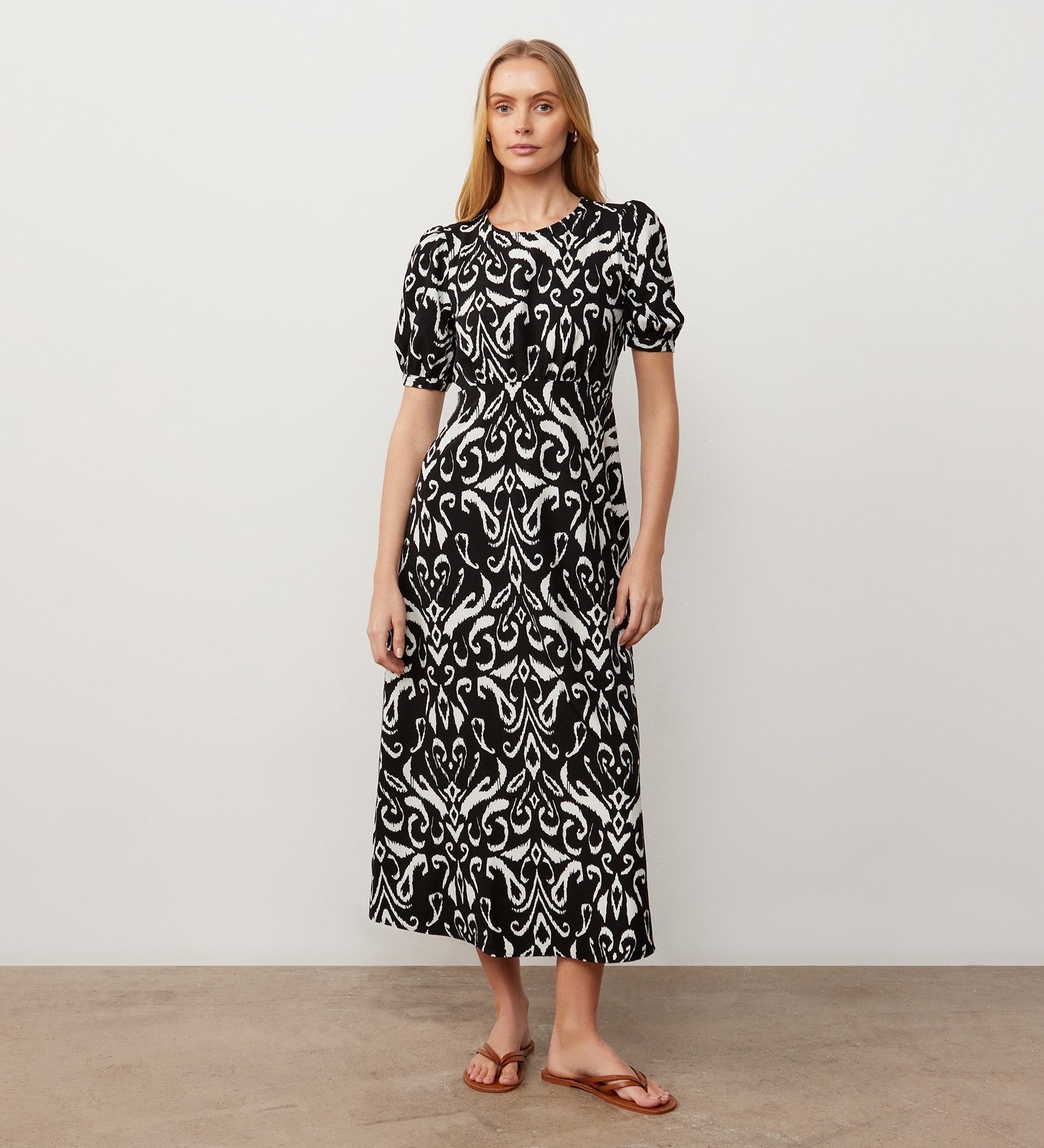 On-trend details ensure Daphne stands out from the crowd. A round neck tea dress, Daphne features a flattering ruched waist, ruffled short sleeves with cuff and button detail. Ensuring to promote a fit and flare style, she also features an invisible side zip, back darts and a rear keyhole fastening with button. Crafted from our easy care textured crepe.