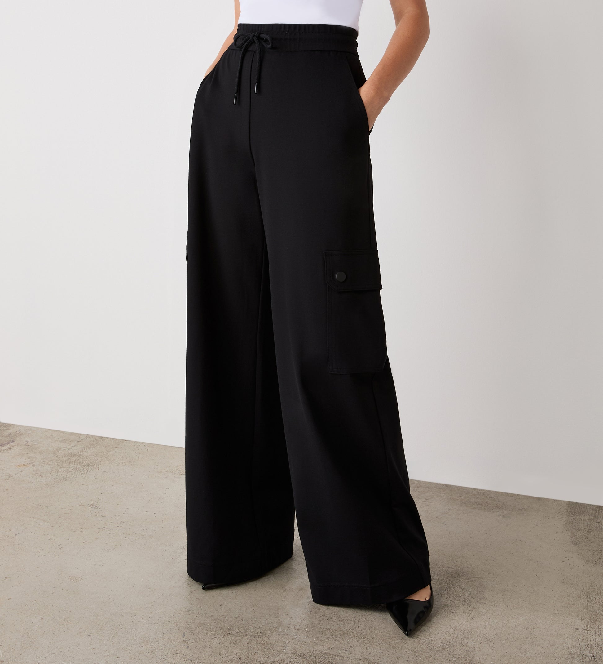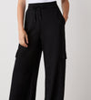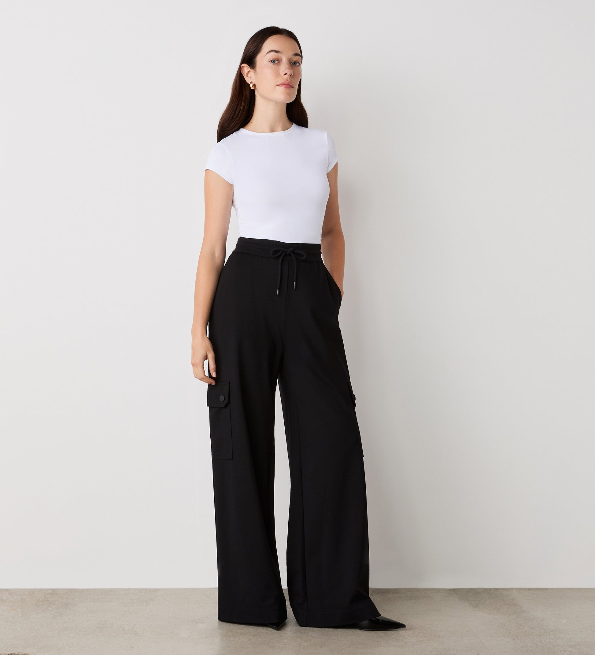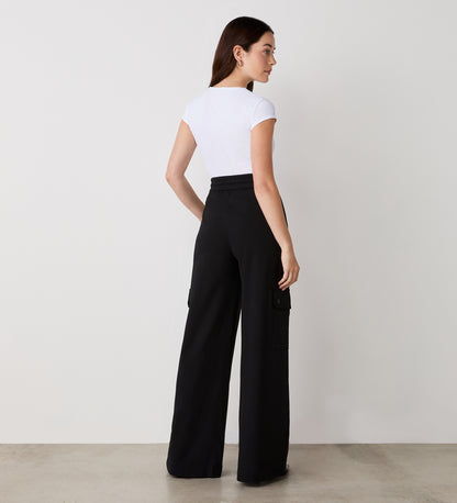 Meet Deliah - our on-trend black high-waisted cargo trousers crafted from Ponte jersey. Wide leg in style with side pockets and cargo-style pockets, she also features an elasticated waistband with an additional drawstring tie.