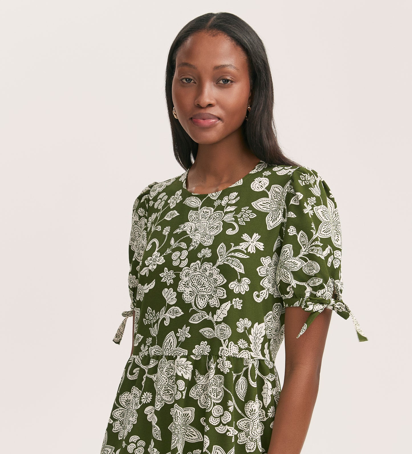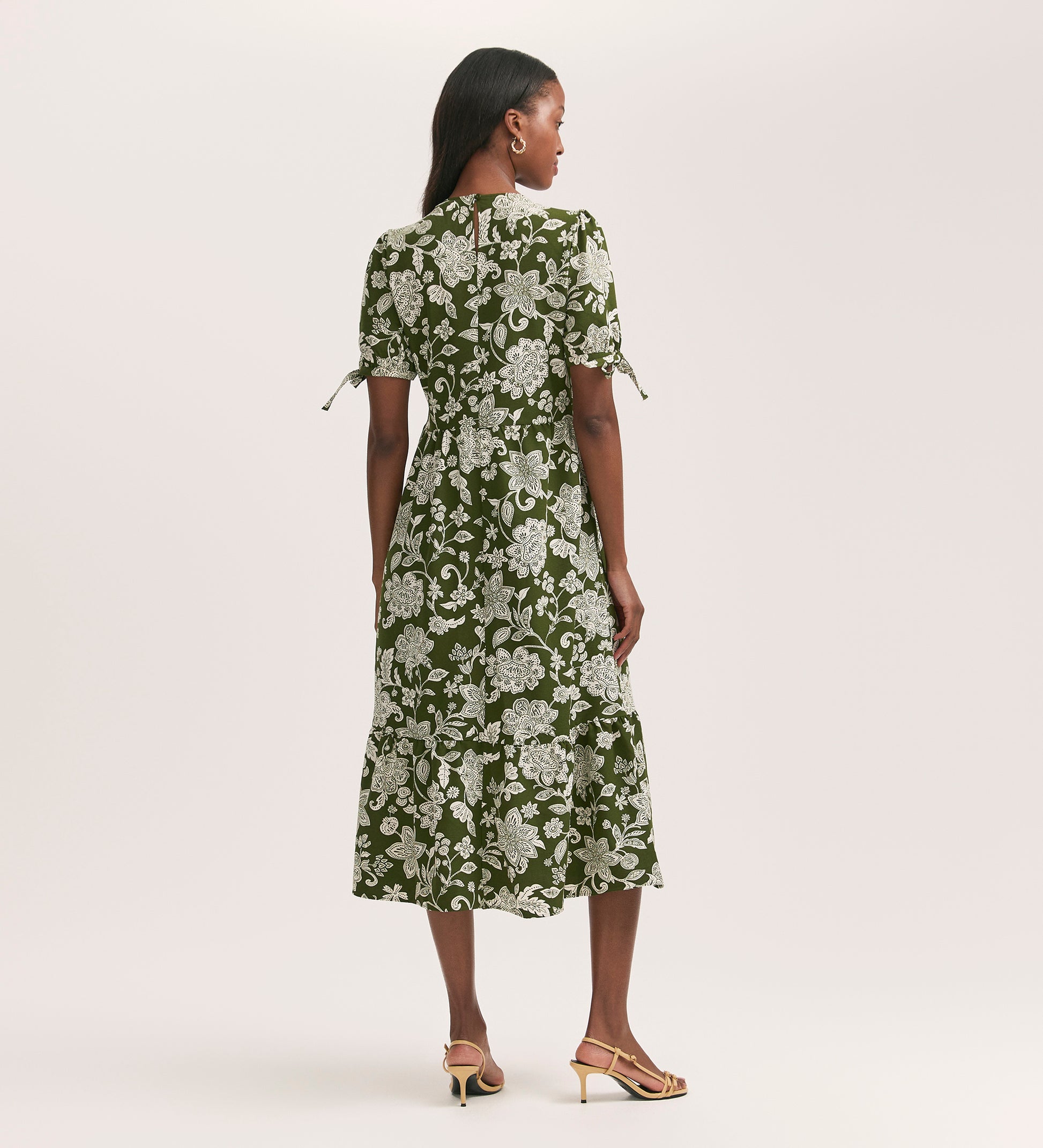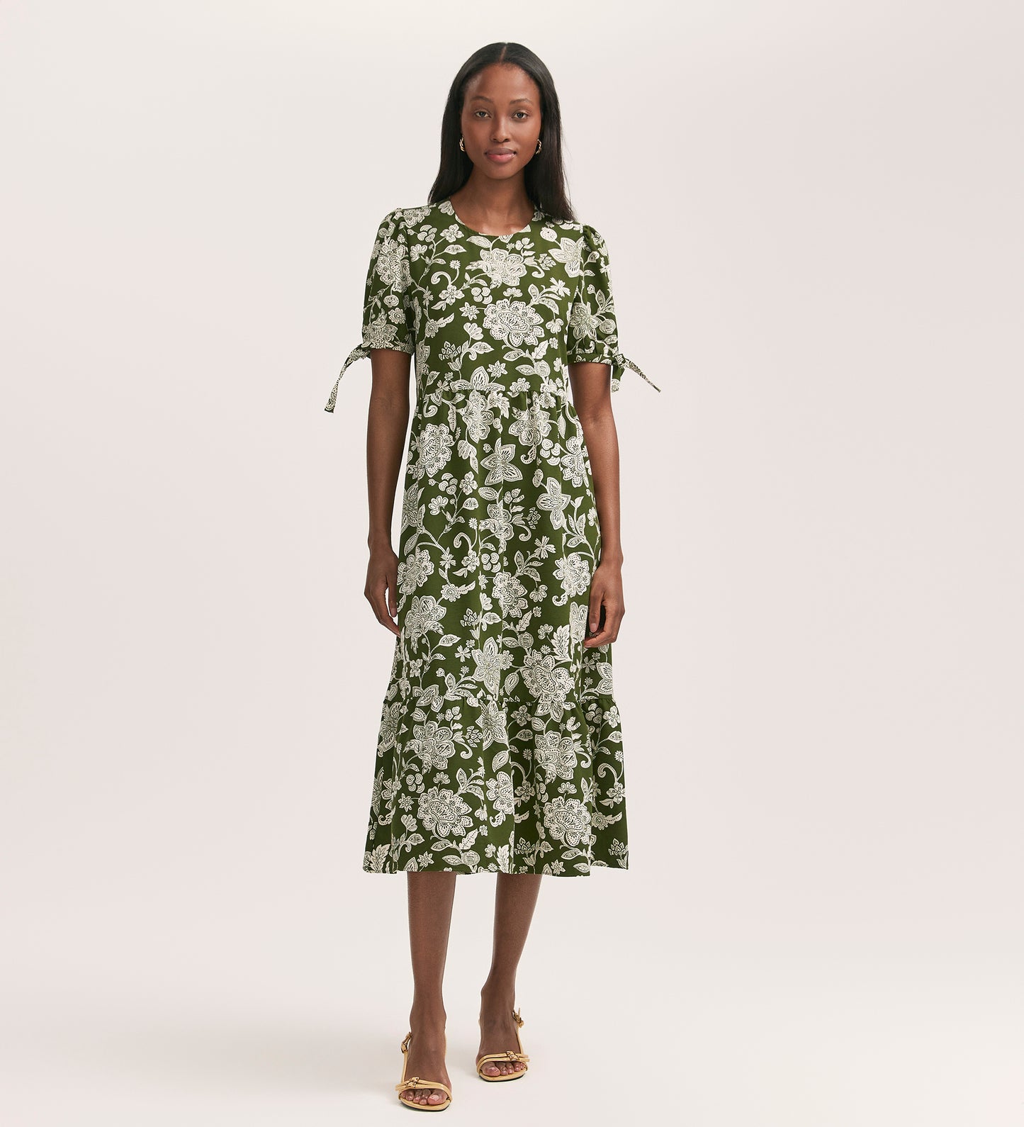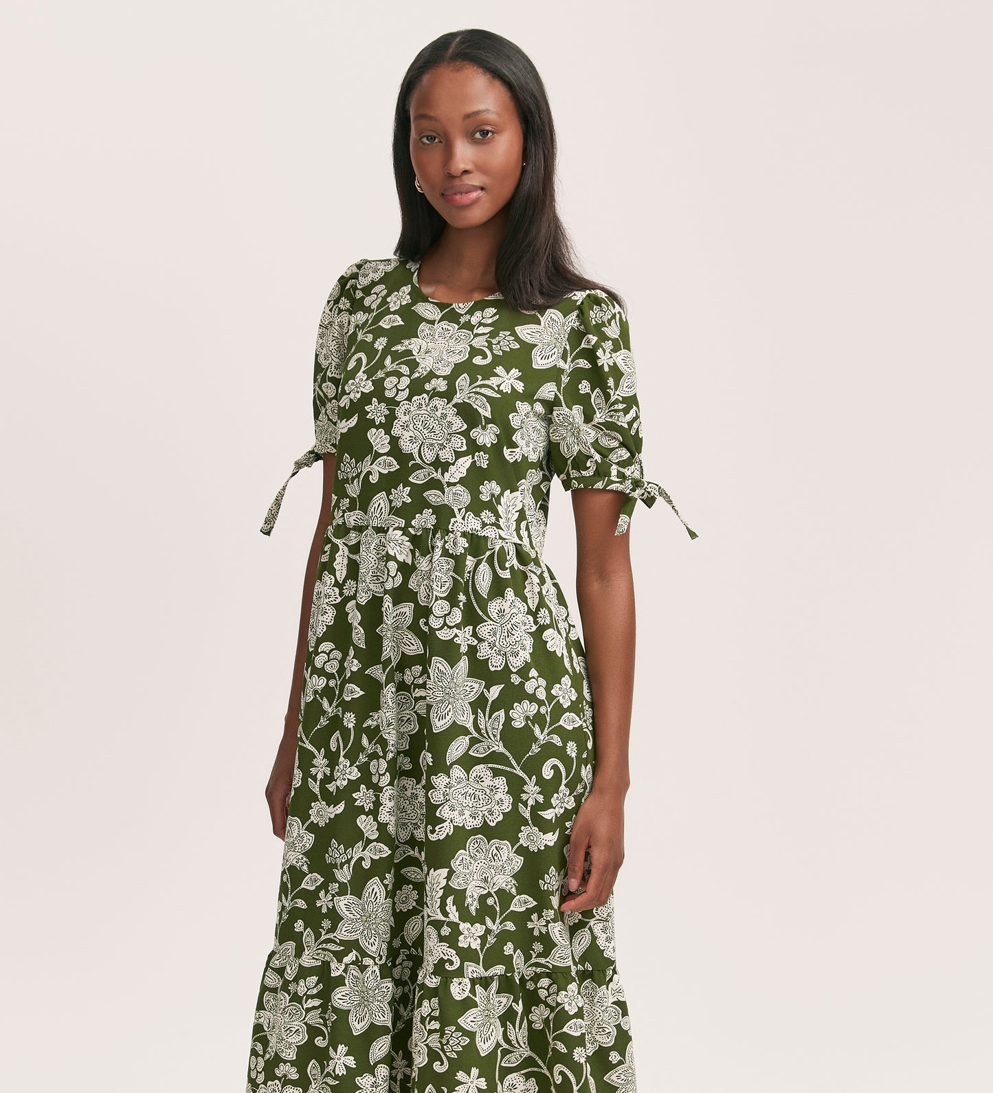 Perfect for every occasion, Demi is a khaki floral tiered midi dress in a relaxed fit with a flattering waist seam and crew neck. Crafted from our crease free crepe fabric, she features a tiered skirt and has puff sleeves with tie detailing.