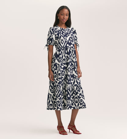 Demi Navy Ikat Crepe Tiered Midi Dress