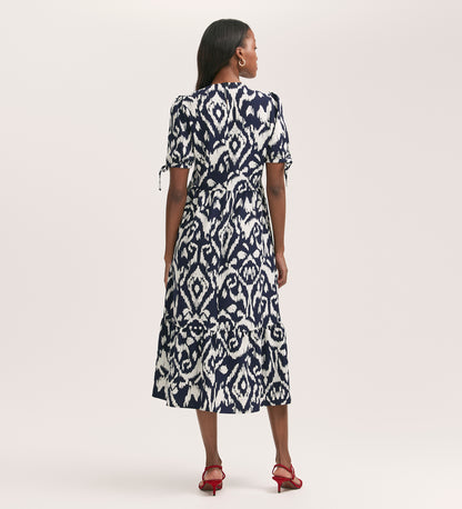 Perfect for every occasion, Demi is a navy Ikat tiered midi dress in a relaxed fit with a flattering waist seam and crew neck. Crafted from our crease-free crepe fabric, she features a tiered skirt and has puff sleeves with tie detailing.