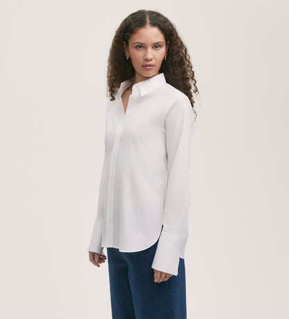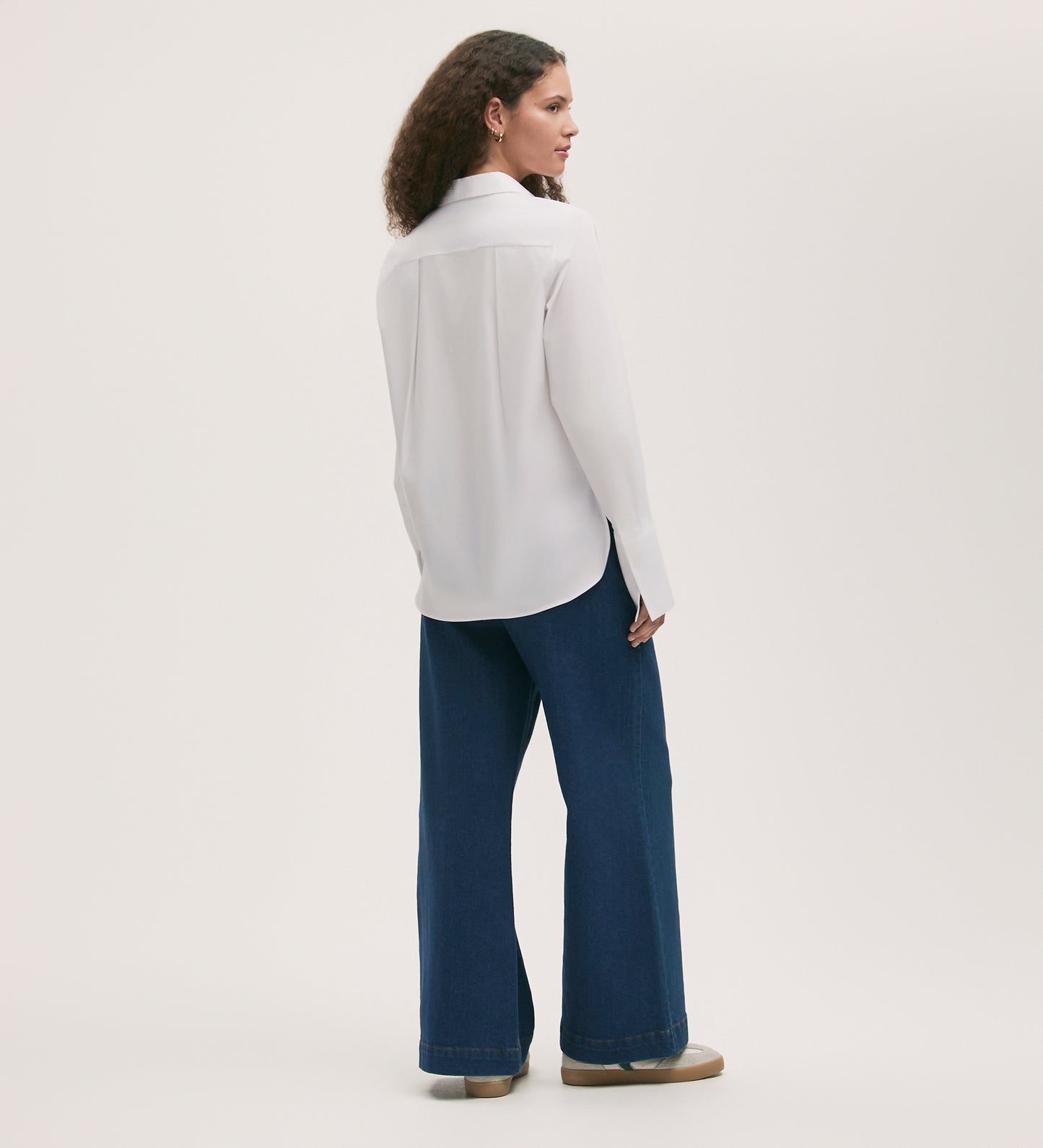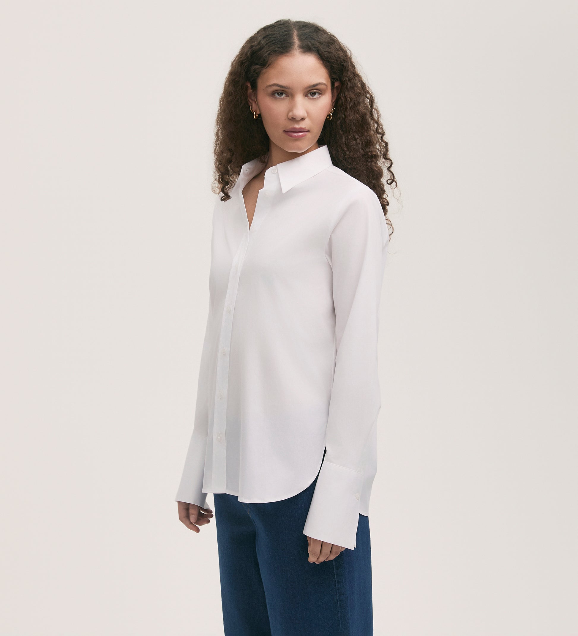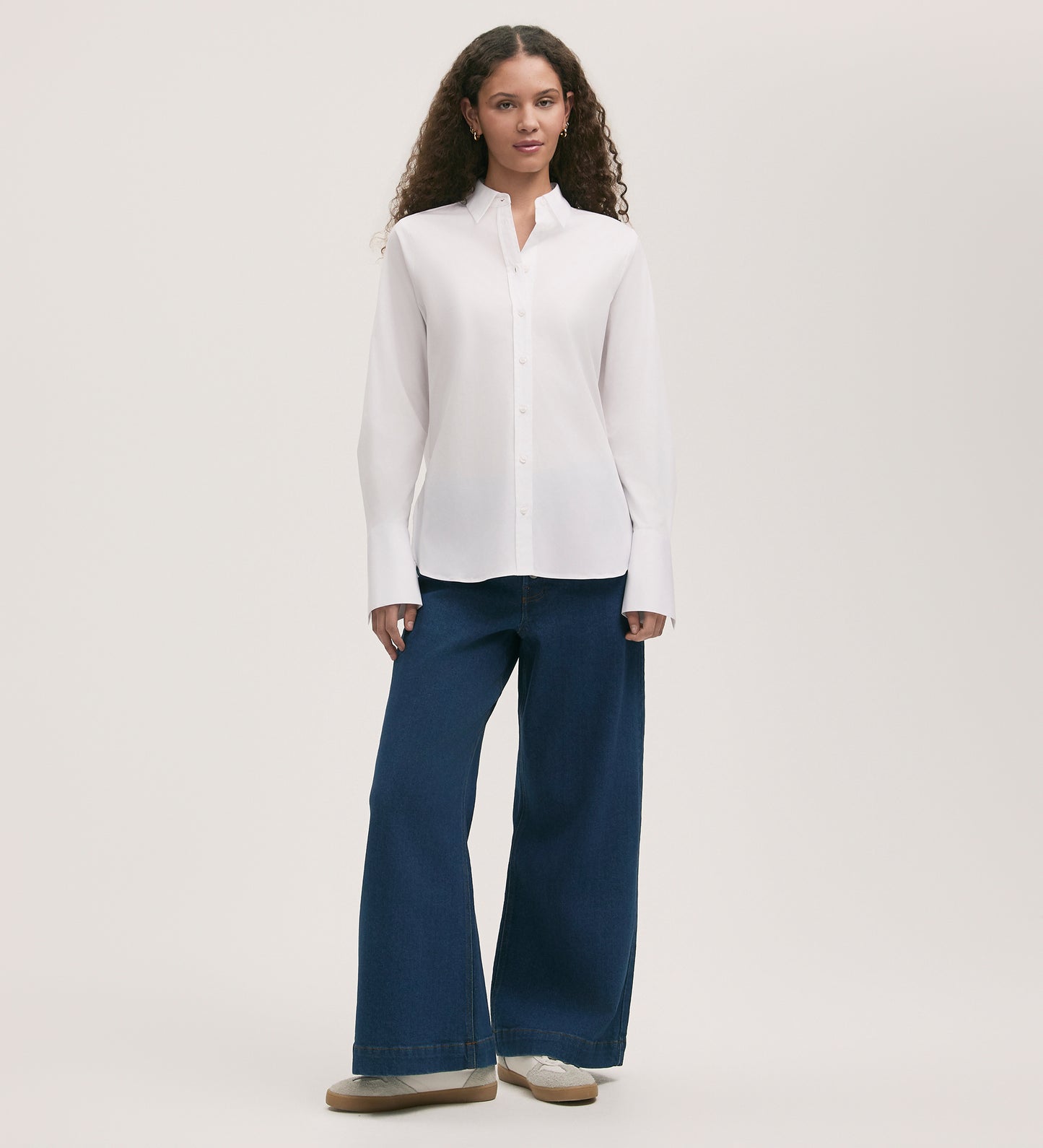 With its crisp outline, this classic white cotton shirt is beautifully simple. It is cut to a timeless regular fit with a collared neck. Back pleat details add flattering femininity to the traditional button-up style, and the deep cuffs can be folded back to add an on-trend, stylish twist.
