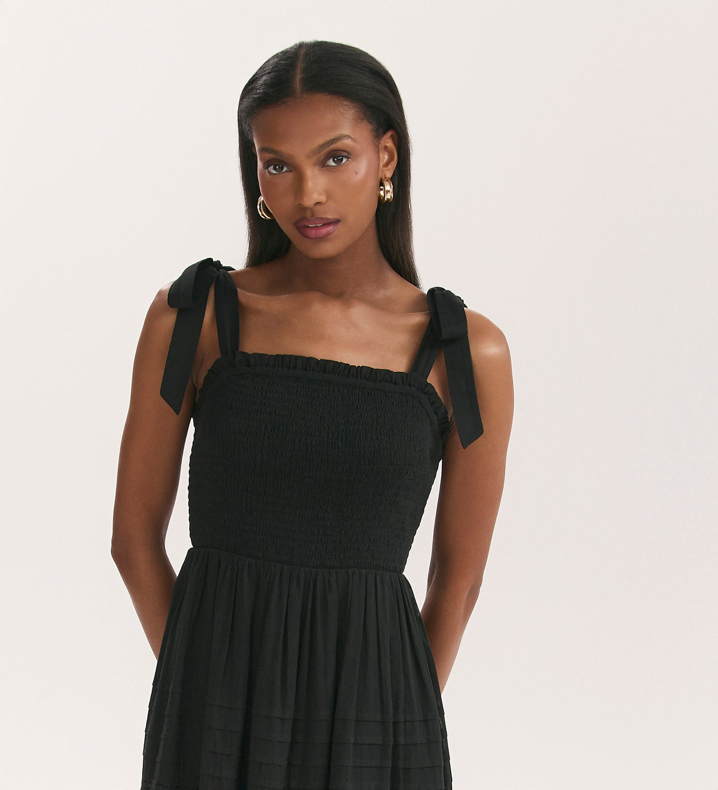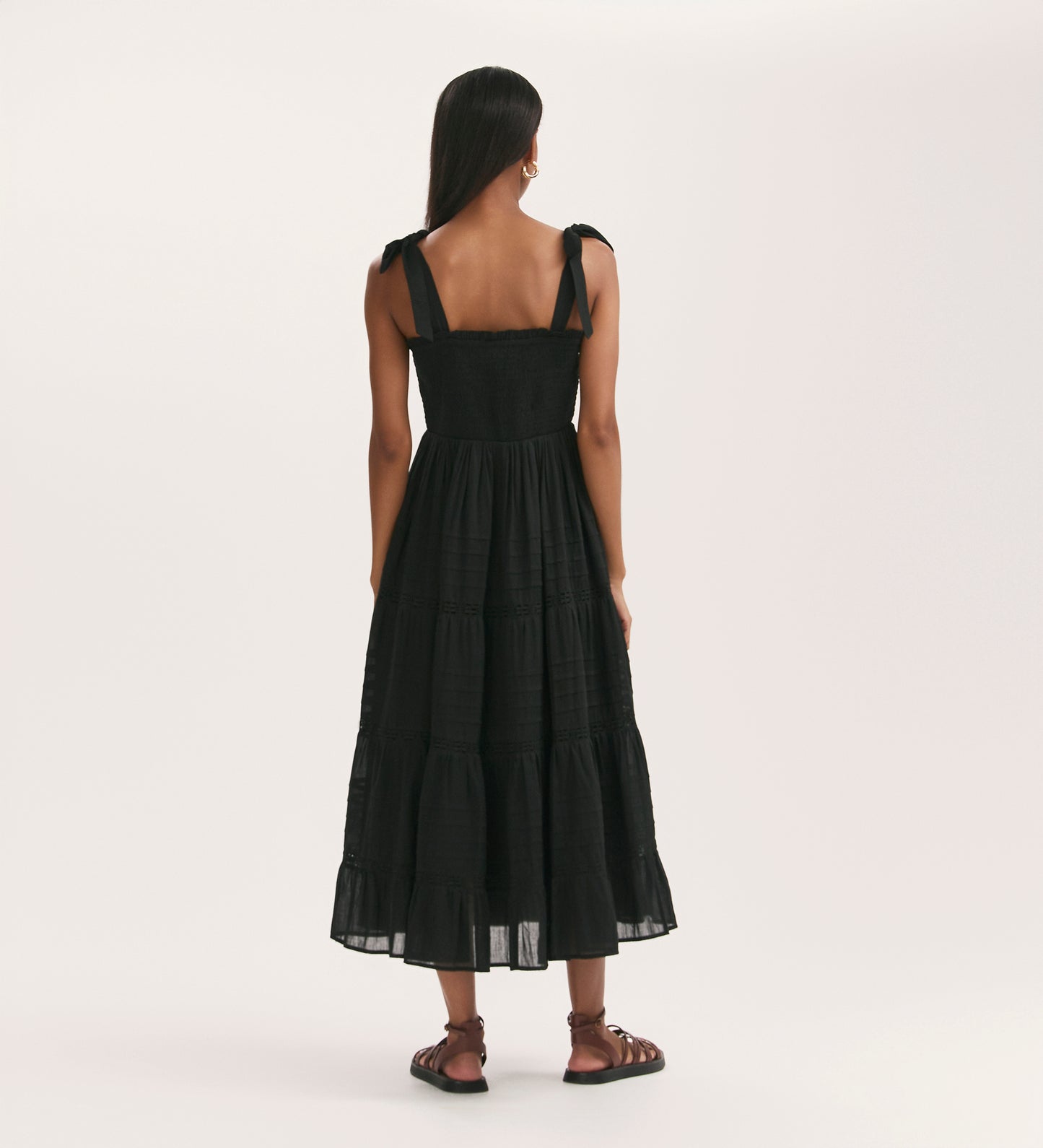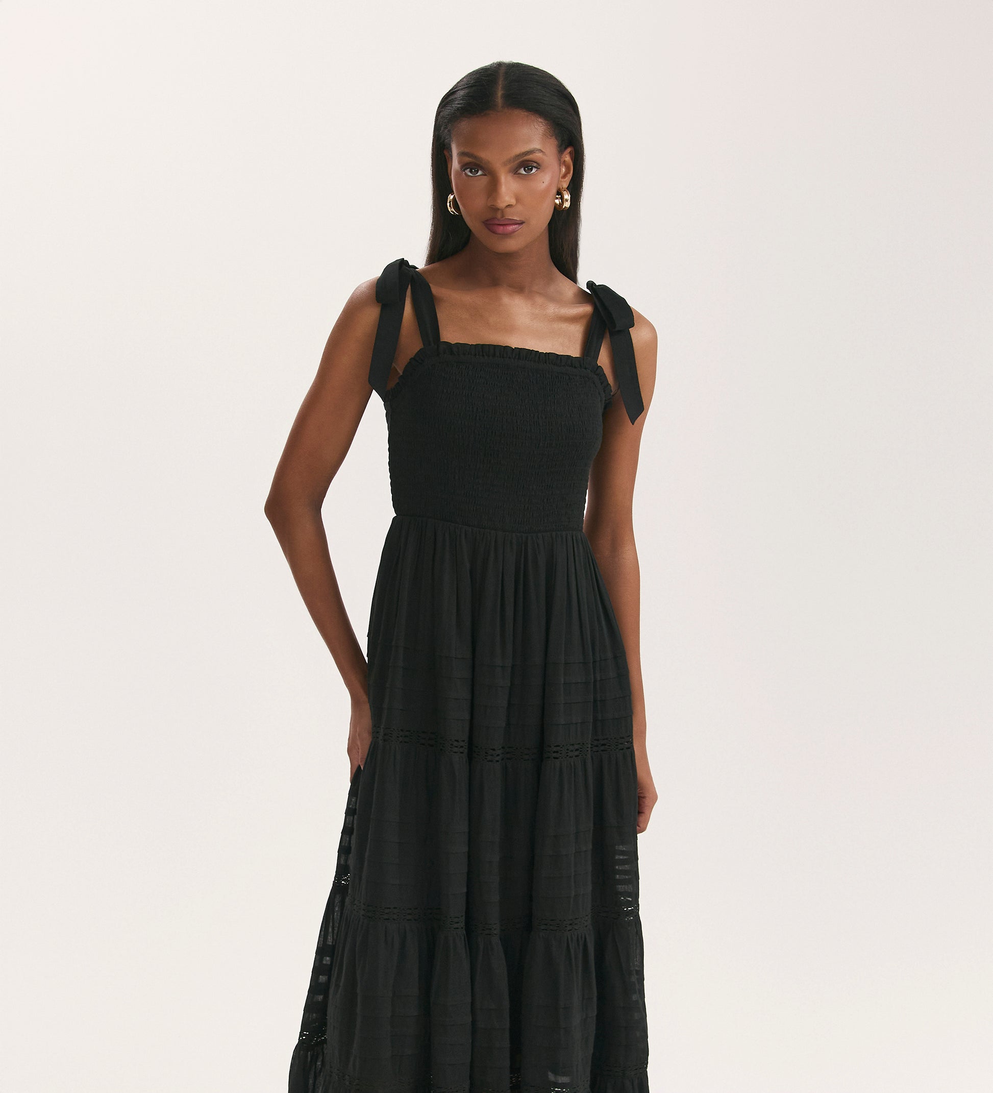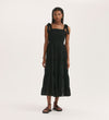 A spring and summer wardrobe essential, Ebony is a black tiered midi dress in cotton with wide self-tie straps. With pintucks and lace trims on the skirt, Ebony also features a figure flattering shirred bodice.