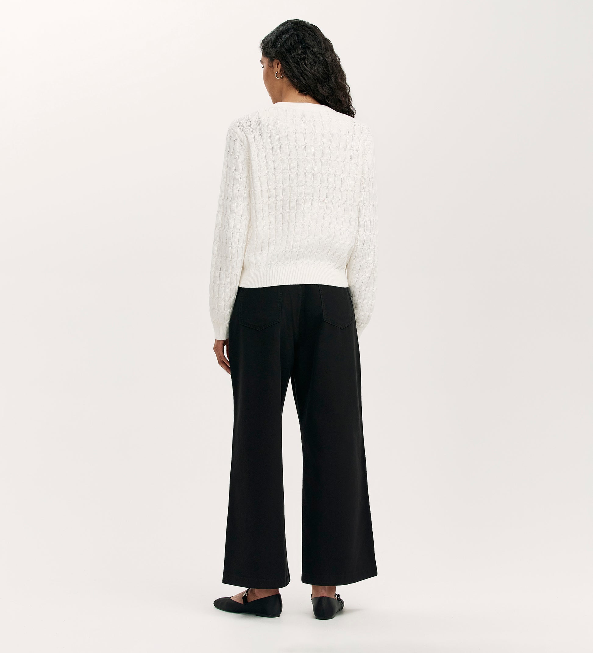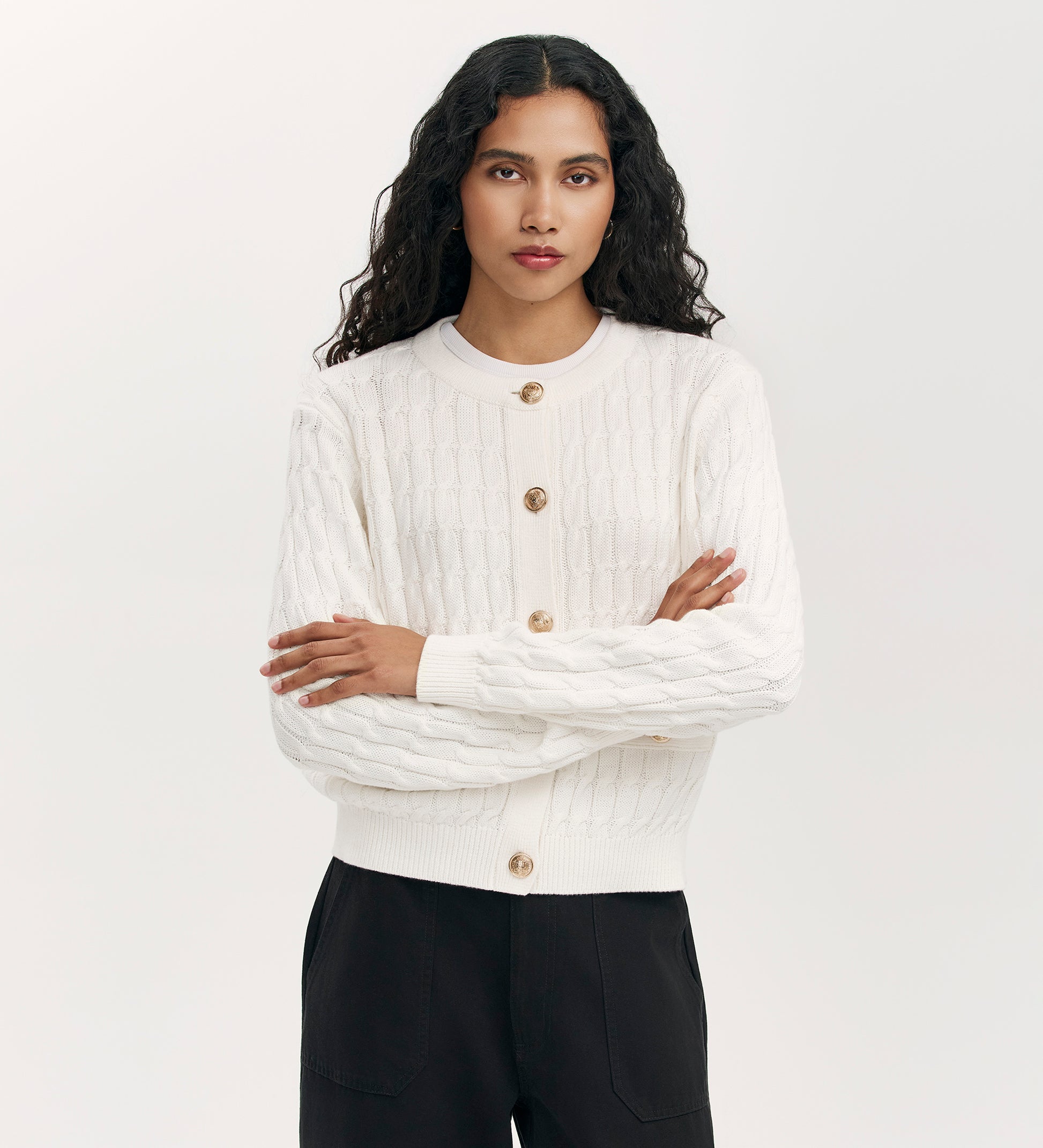 Elaine is a knitted cardigan that balances cosy texture with timeless detail. Featuring a round neckline and long sleeves, she's crafted in a classic cable knit and finished with gleaming gold buttons. Front pockets add practicality, while her relaxed fit makes Elaine an easy layering piece you'll reach for season after season.