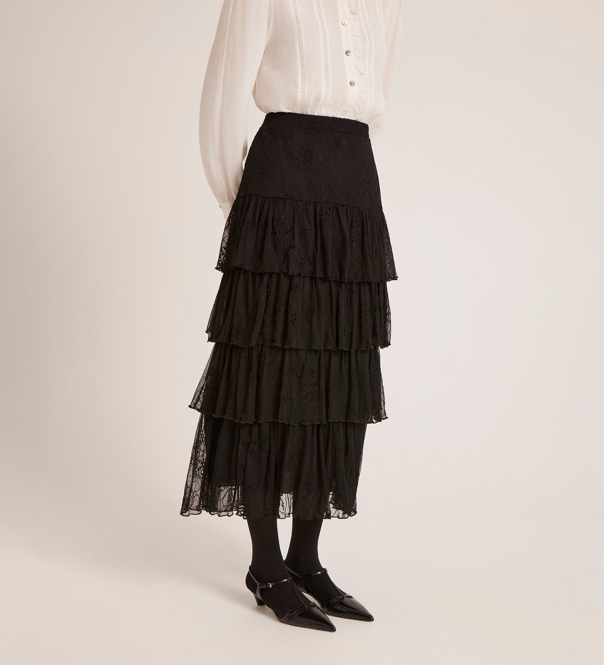 Textured and full of movement, the Elisa Skirt is an effortless way to embrace seasonal patterns. Crafted from a delicate floral embroidered mesh fabric, this midi length skirt features a comfortable elasticated waistband for all-day ease. The tiered skirt is finished with ruffle layers that add a playful, feminine volume to your look. Pair it with a simple tucked-in tee or a slim-fit knit to let the intricate embroidery take centre stage.