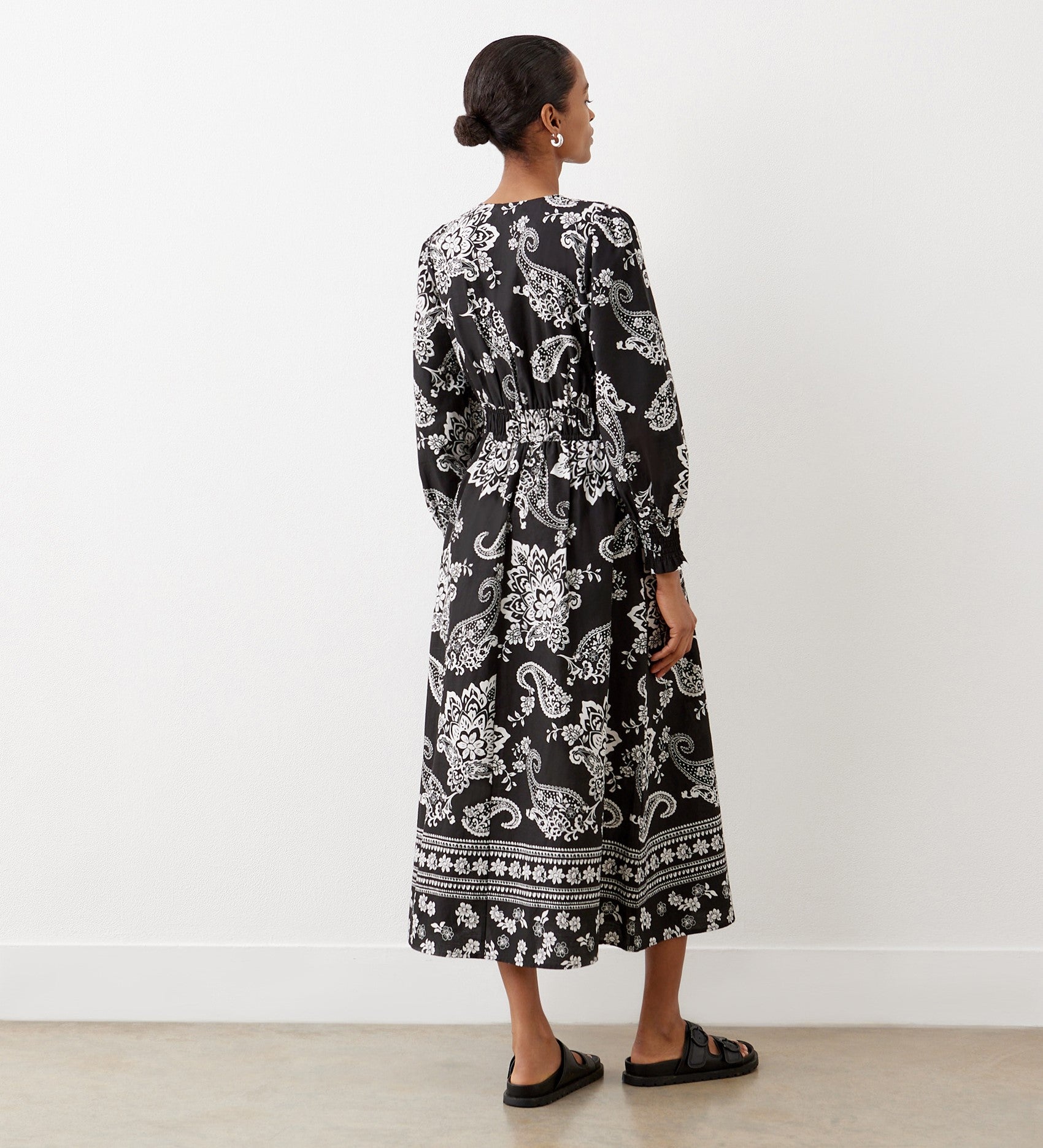 Crafted from 100 per cent cotton fabric, Elodie is a button-through midi dress with a flattering empire waist panel and a feminine v-neckline. Long elegant sleeves flow into elasticated cuffs, while a shirred rear waist band enhances the silhouette. Elodie also much features functional side pockets