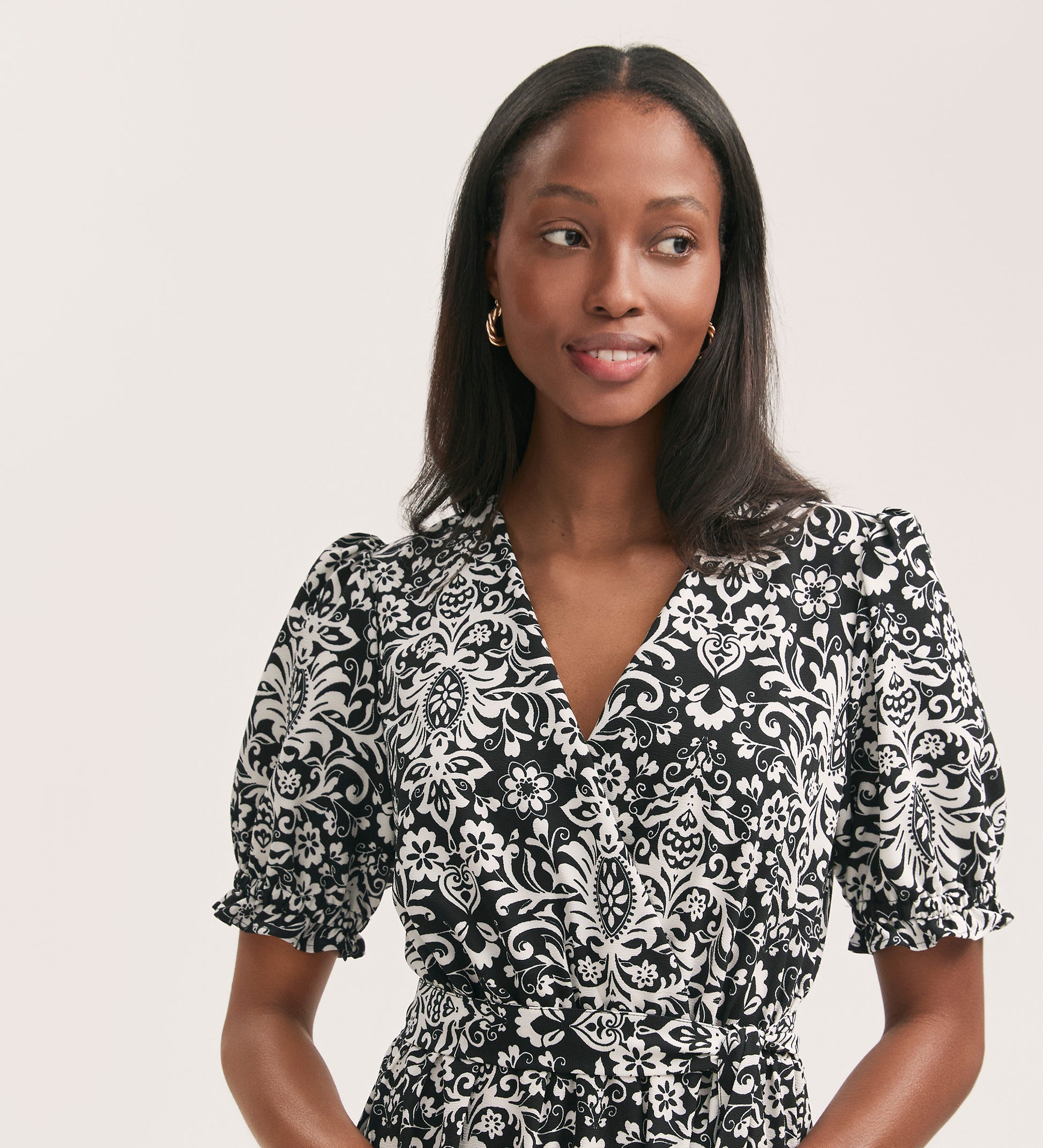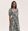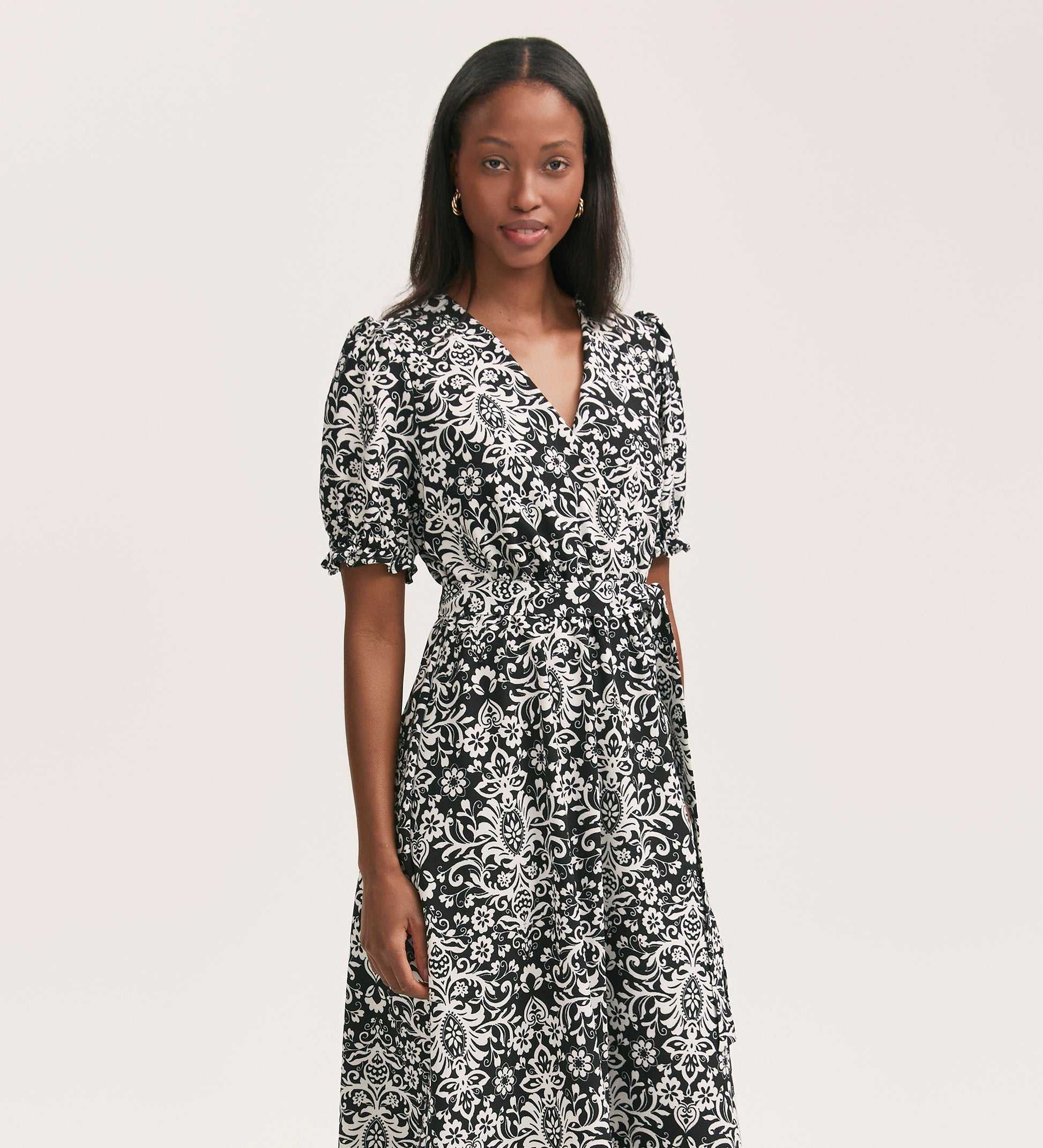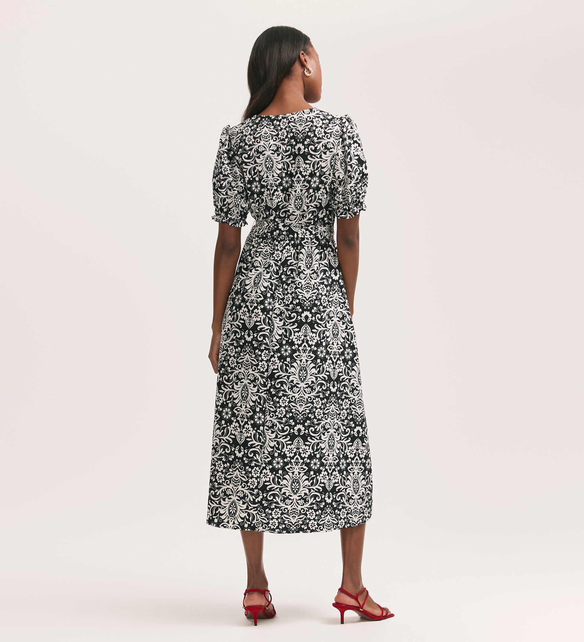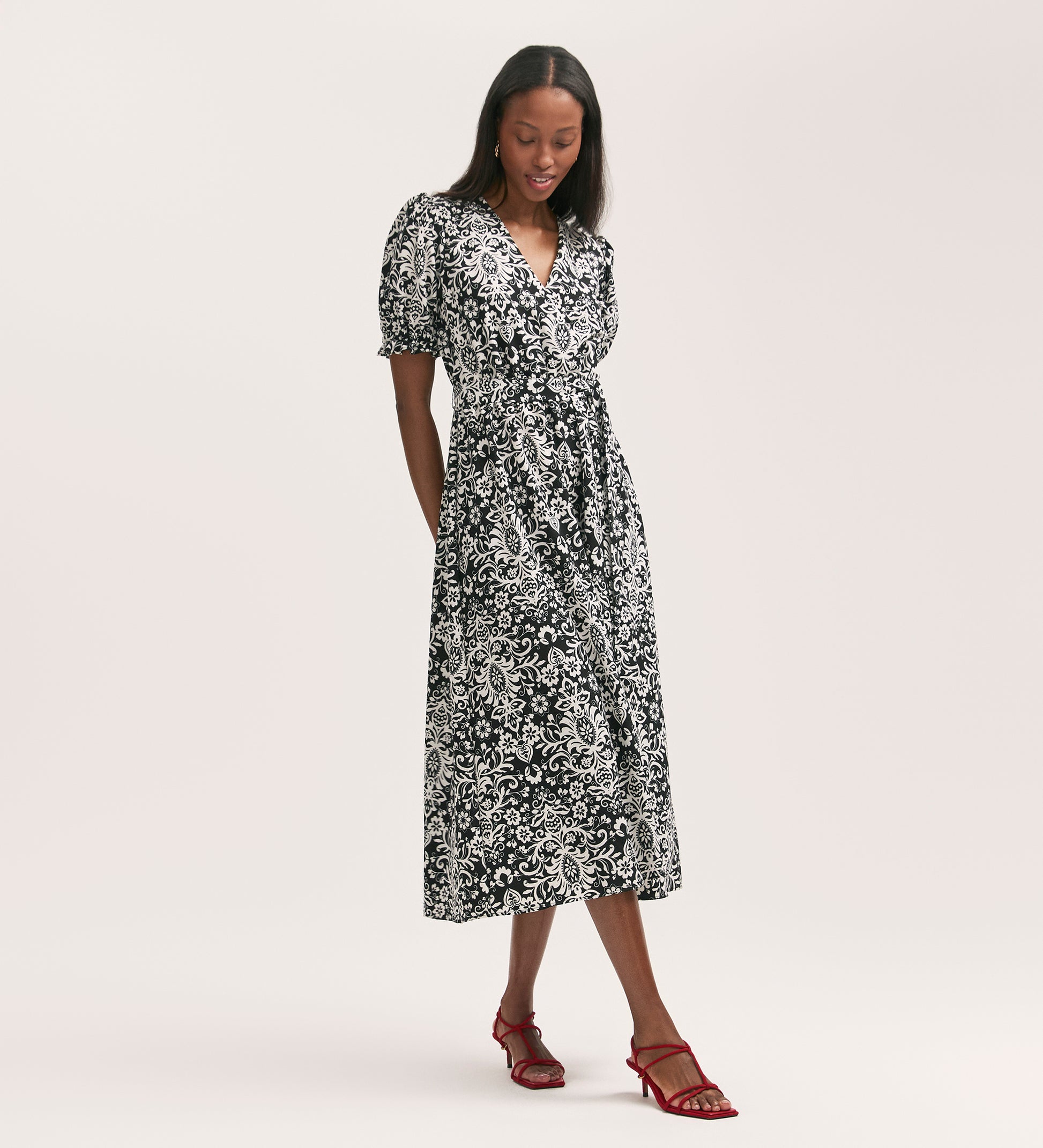 Everleigh is a black paisley mock-wrap midi dress with a v-neck and elasticated waist, crafted from our crease-free crepe fabric. She also features short puff sleeves with elasticated cuffs that add to the flattering fit and flare style.