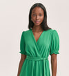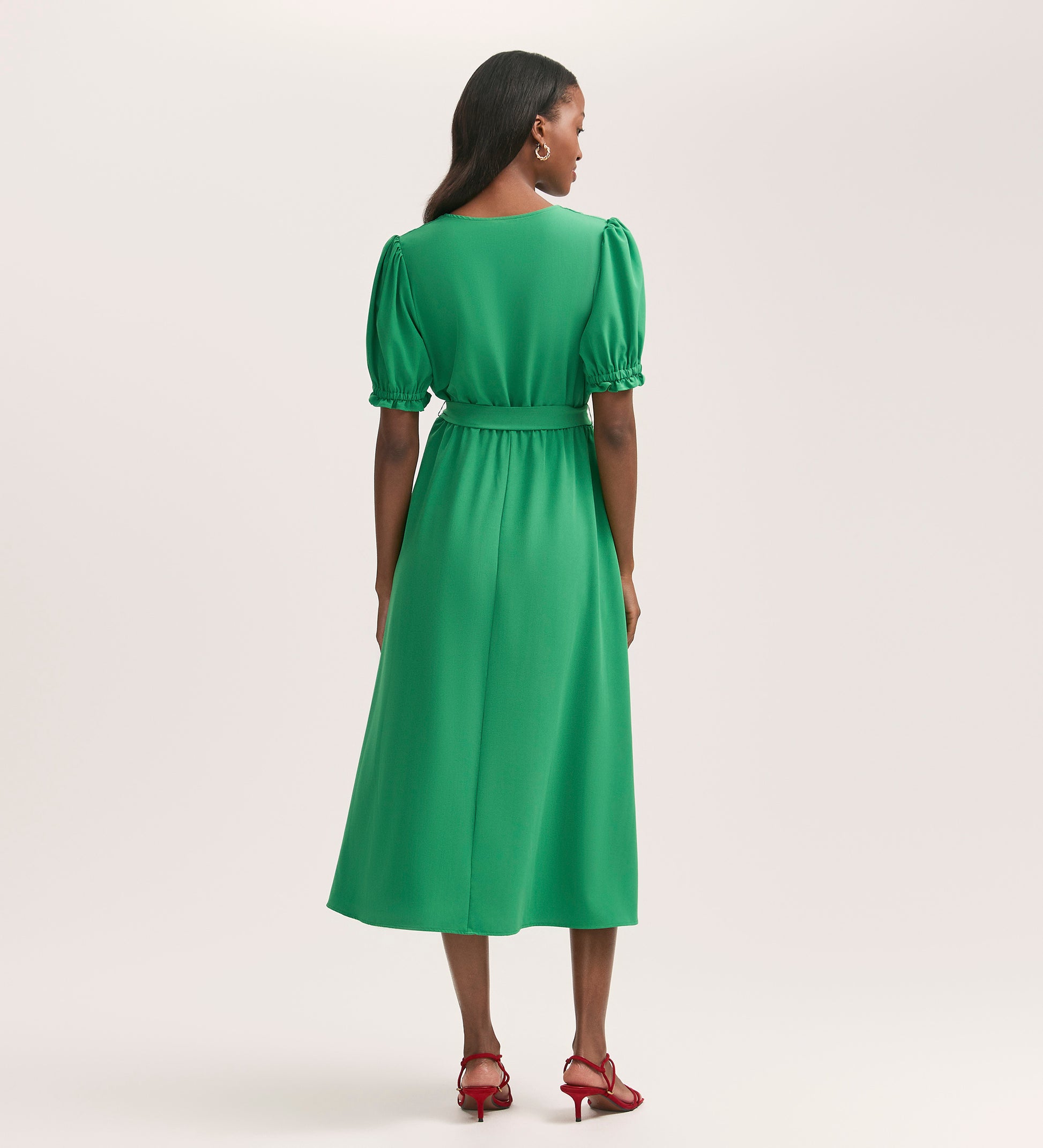 Everleigh is a green mock-wrap midi dress with a v-neck and elasticated waist, crafted from our crease-free crepe fabric. She also features short puff sleeves with elasticated cuffs that add to the flattering fit and flare style.