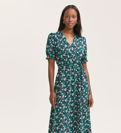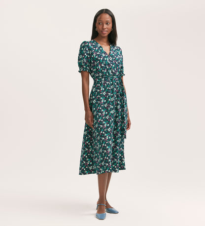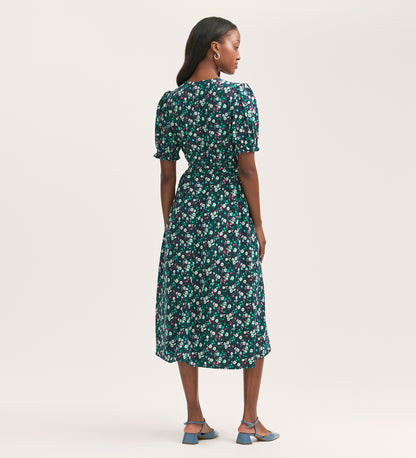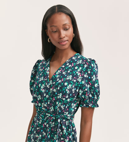 Everleigh is a navy floral mock-wrap midi dress with a v-neck and elasticated waist, crafted from our crease-free crepe fabric. She also features short puff sleeves with elasticated cuffs that add to the flattering fit and flare style.