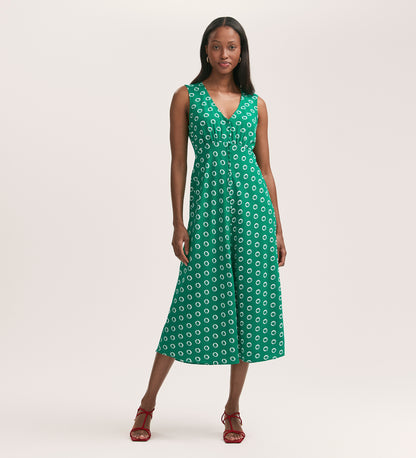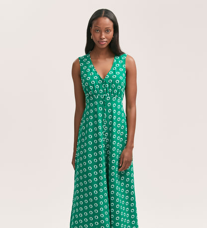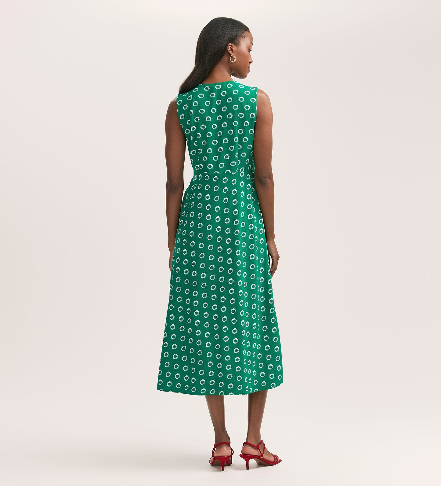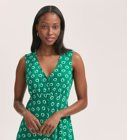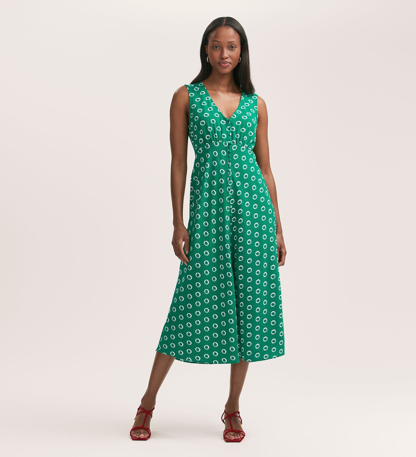 Flora is a green polka dot sleeveless midi dress crafted from our crease-free crepe fabric. A waist seam, feminine V-neck and button-down front ensure a flattering fit.