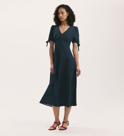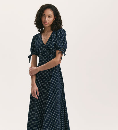 Gabriella Navy Polka Dot Crepe Midi Tea Dress