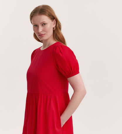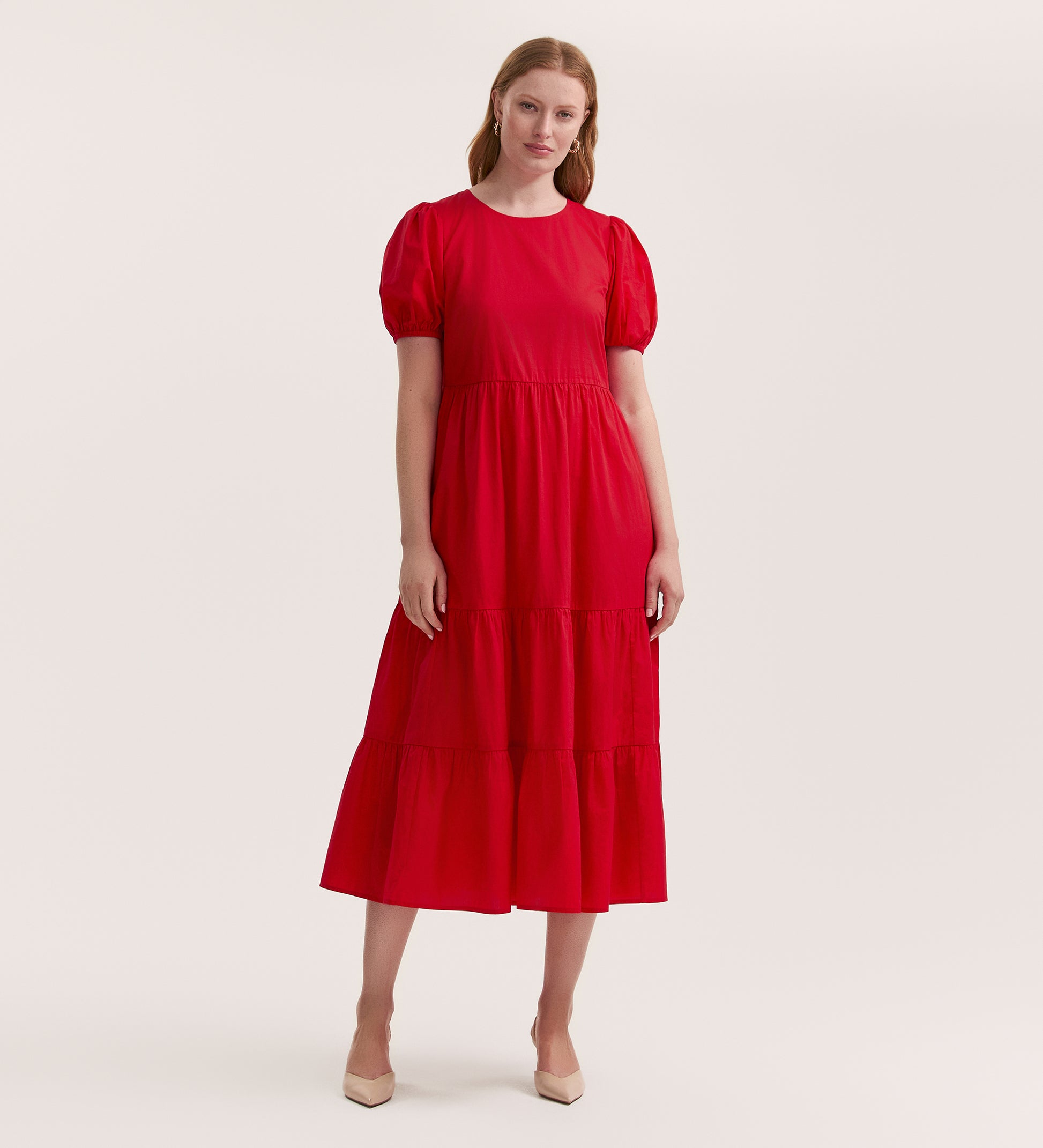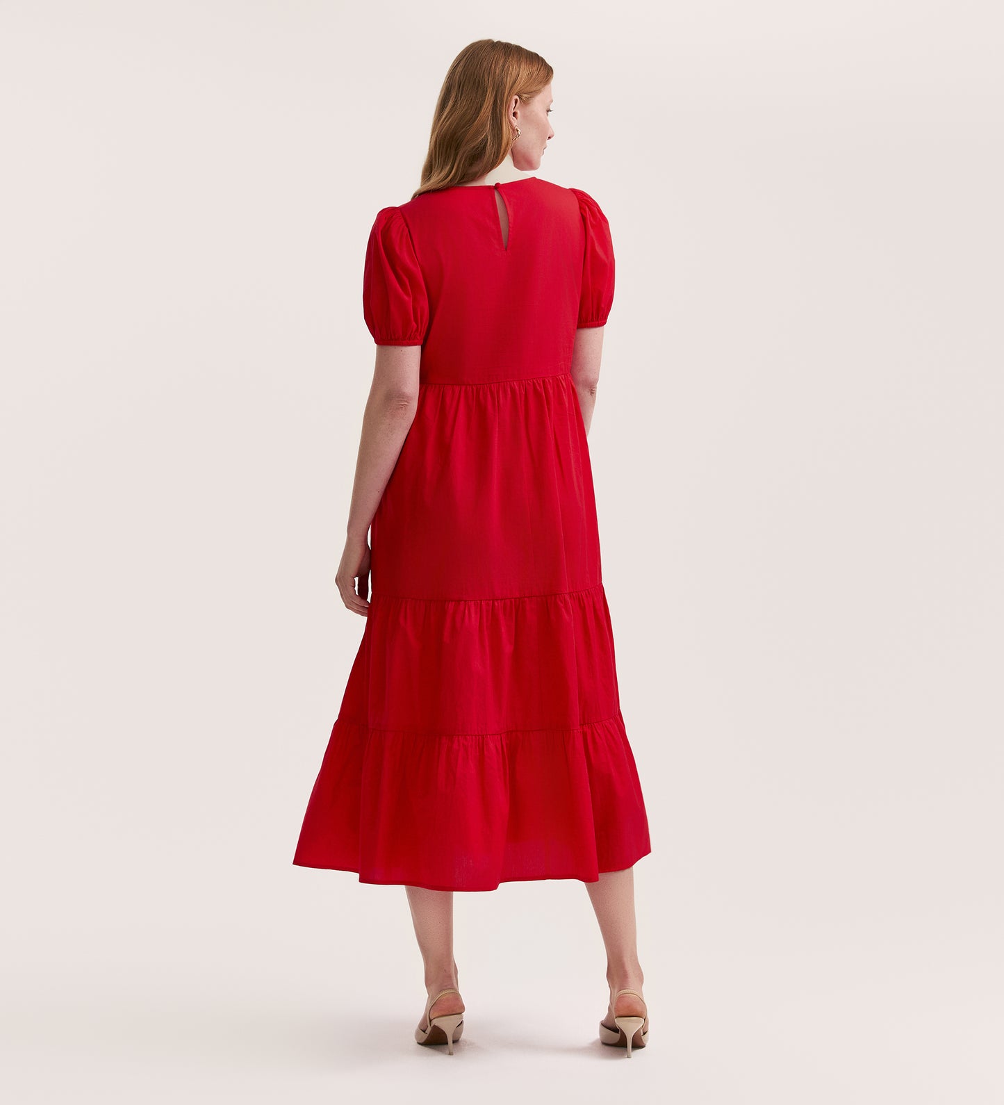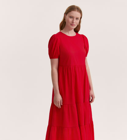 Meet Genevive - a red tiered midi dress crafted from cotton. With comfort in mind, she features short puff sleeves with elasticated cuffs, a feminine crew neck and a relaxed fit. To the rear, Genevive has a button fastening and keyhole detail.