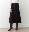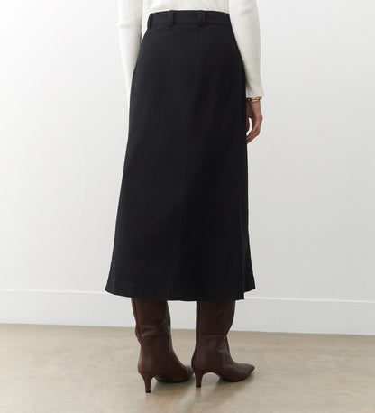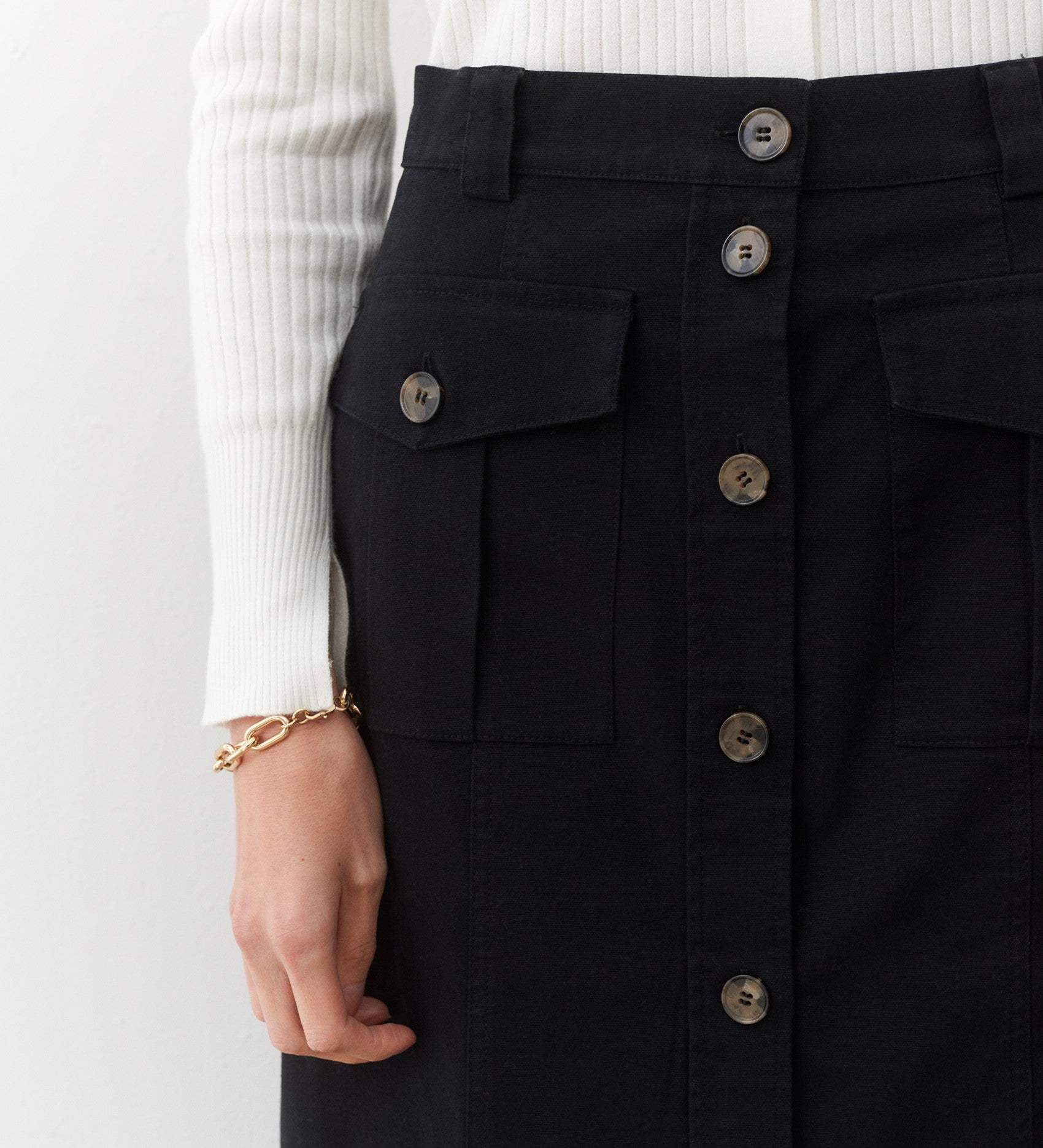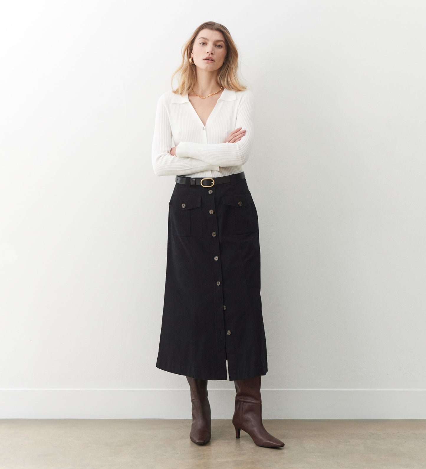 Crafted from a slightly stretchy lightweight canvas fabric, Gia is a midi skirt with patch front pockets and is buttoned-down with tortoiseshell buttons. She also features belt loops for a stylish belt addition.