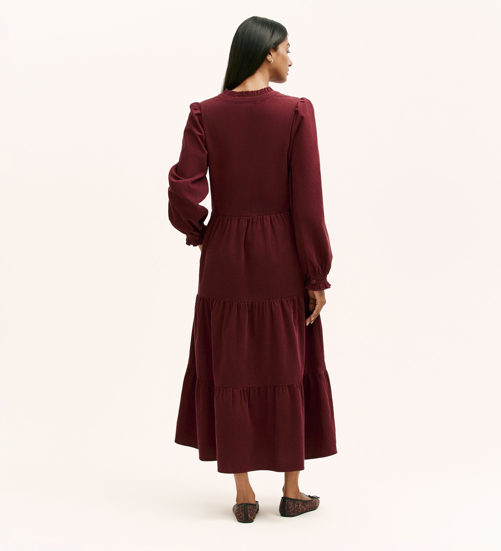 Gianna is a corduroy midi dress designed with cozy, on-trend style for autumn and winter. She features a frill-trimmed neckline and matching cuff frills, adding a feminine and playful touch to the classic silhouette. The tiered skirt creates gentle volume and movement, while front buttons and practical pockets combine style with functionality. Perfect for layering over knitwear or pairing with boots, Gianna is a versatile wardrobe staple that transitions effortlessly from day-to-night occasions.